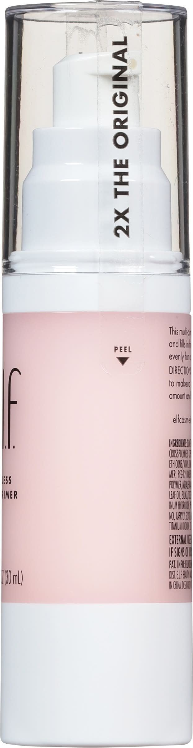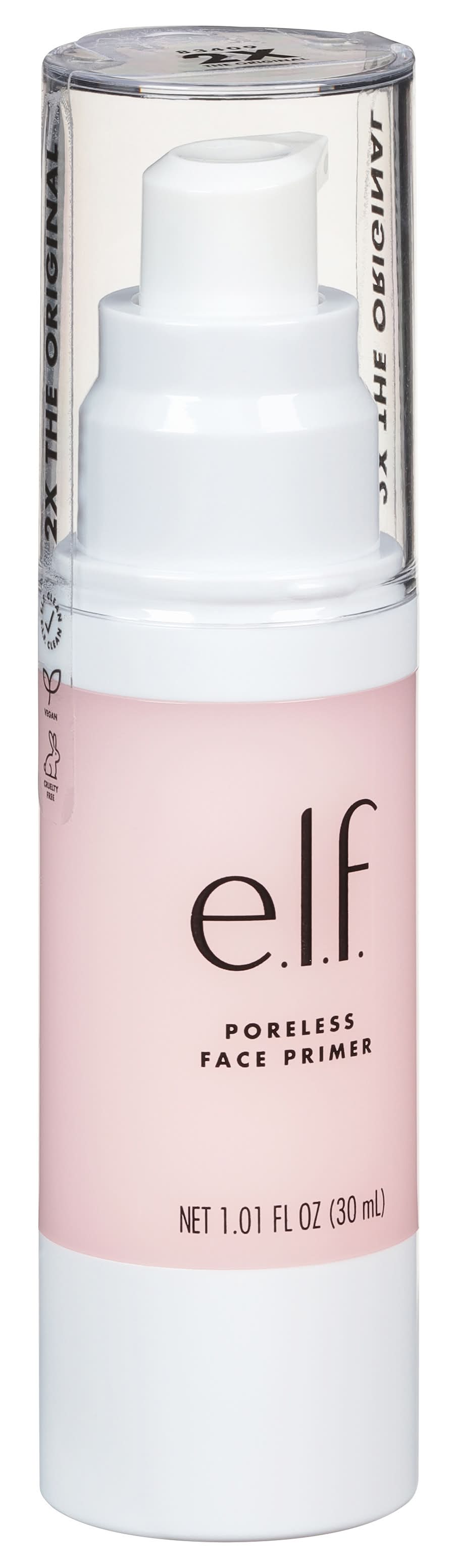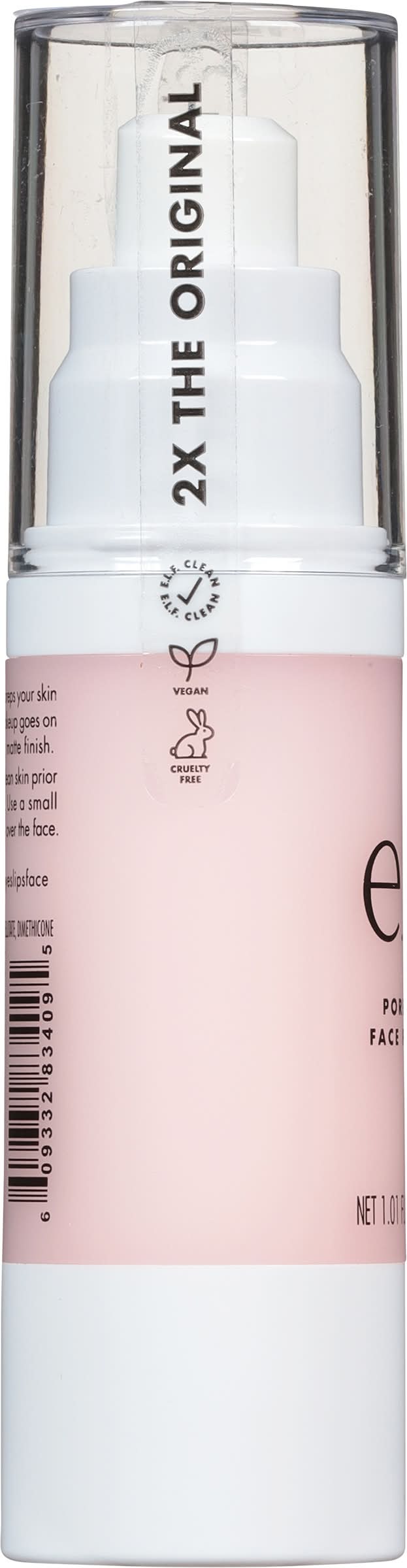 Vegan. 2x the original. This multi-purpose primer preps your skin and fills in fine lines so makeup goes on evenly for a long lasting matte finish. E.L.F. clean. elfcosmetics.com. (hashtag)eyeslipsface. Cruelty free. Made in China. Designed in the U.S.A. e.l.f. Beauty, Oakland, CA, 94607