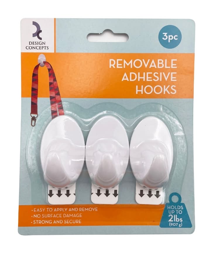 Once you try it, you'll be absolutely HOOKED on this product! Design Concepts Removable Adhesive Hooks are self-adhesive and designed to make hanging, storage, and decoration easier than ever. Each pack comes with 3 white hooks and all of the necessary hardware to hang them. The adhesive pads are easy to apply to any flat surface and can easily be removed when finished without any damage to the surface. Each hook holds up to 2 pounds and is great for hanging purses, bags, coats, keys, decor pieces, pictures, and beyond. Color: White