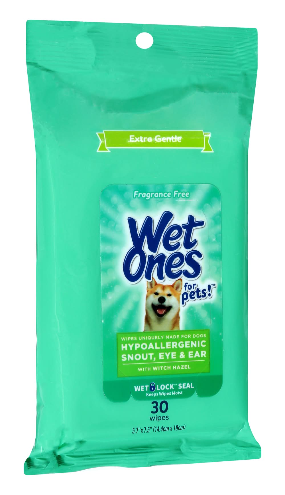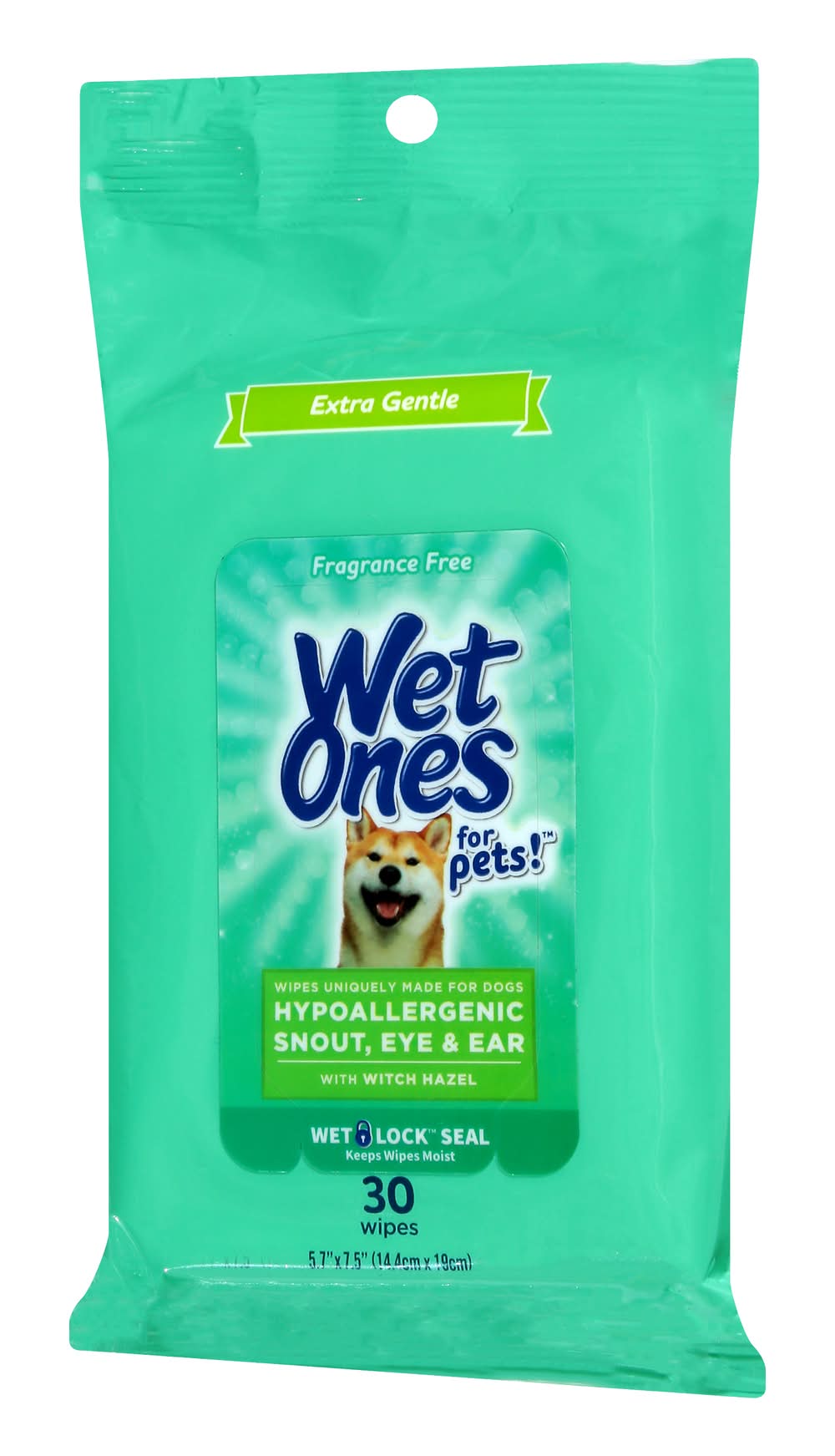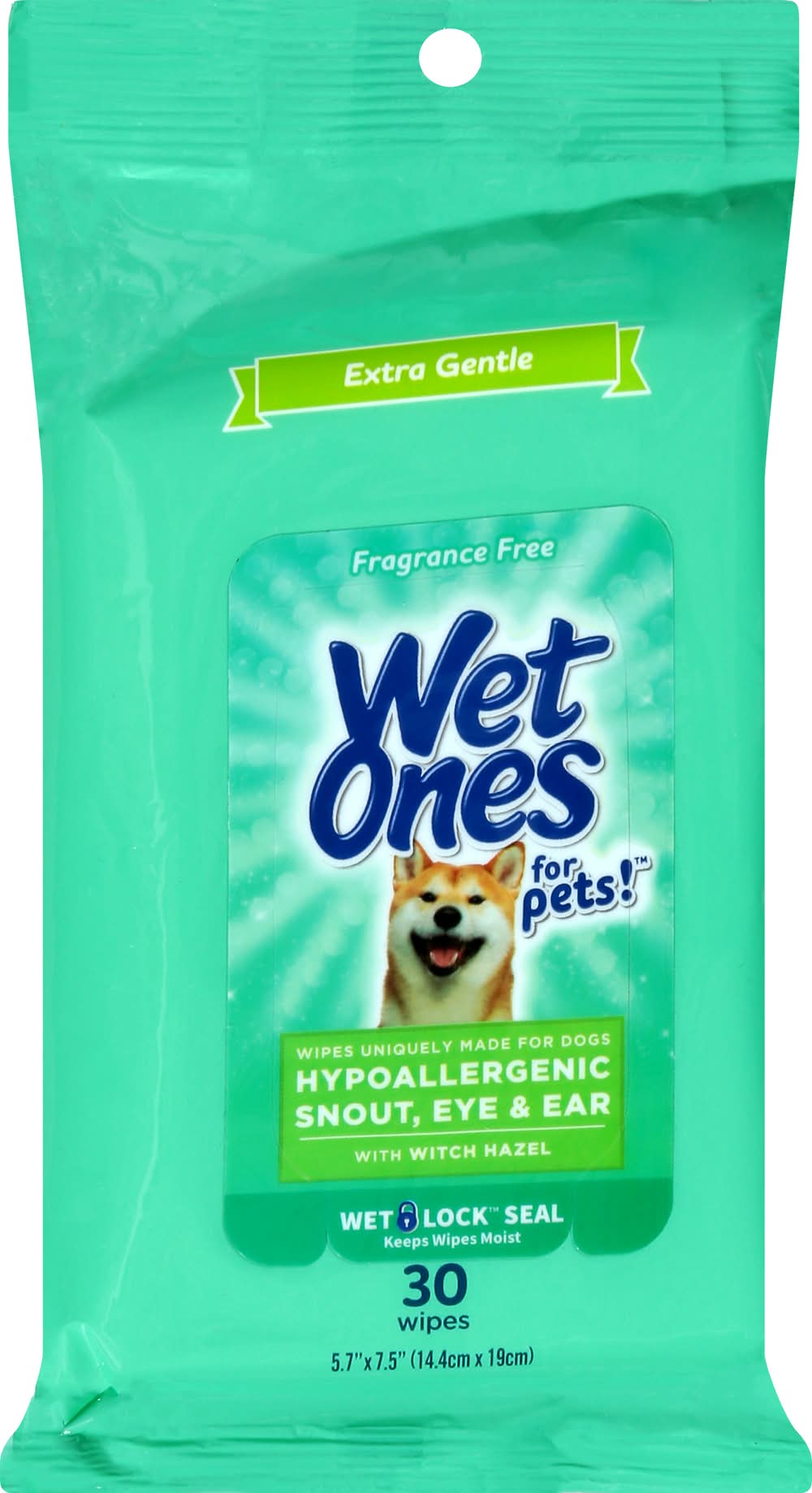 5.7 in x 7.5 in (14.4 cm x 19 cm). Extra gentle. Wipes uniquely made for dogs. Hypoallergenic. Snout, eye & ear. With witch hazel. Wet Ones for Pets wipes for dogs are uniquely formulated with your pet in mind for a quick, gentle and healthy clean anytime, anywhere! Wet Ones for Pets Hypoallergenic Snout, Eye & Ear Wipes for Dogs are fragrance free to be non-irritating and gently removes dirt, tear strains and wax build-up in sensitive areas. Formulated with witch hazel, which naturally soothes skin and helps maintain a healthy plush coat. fetch4pets.com. Question or comments? Visit: fetch4pets.com. Call: 1-855-430-8100. Wet Lock Seal: Keeps wipes moist. Made in China. FETCH FOR PETS,