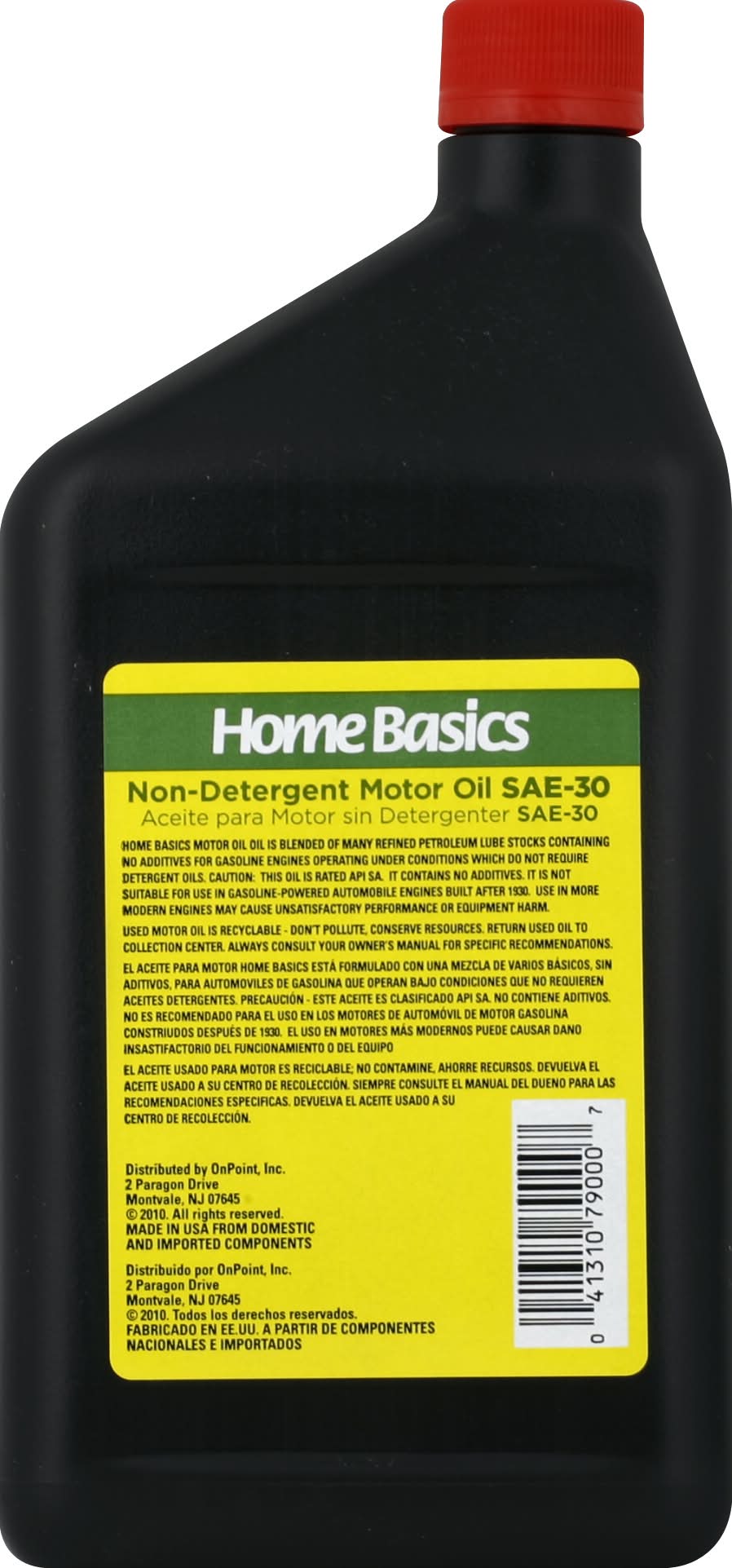 Home Basics Motor Oil is blended of many refined petroleum lube stocks containing no additives for gasoline engines operating under conditions which do not require detergent oils. Caution: This oil is rated API SA. It contains no additives. It is not suitable for use on gasoline-powered automobile engines built after 1930. Use in more modern engines may cause unsatisfactory performance or equipment harm. Made in USA from domestic and imported components. ONPOINT,