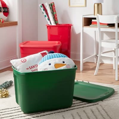 Organize pillows, toys and other items with the 18-Gallon Non-Latching Tote from Brightroom. This storage tote comes in a rectangular shape with a lid to help keep the contents covered. Made of plastic, this lidded storage tote holds up to 18 gallons and makes a functional addition to your home. Brightroom: See your space in a new light.