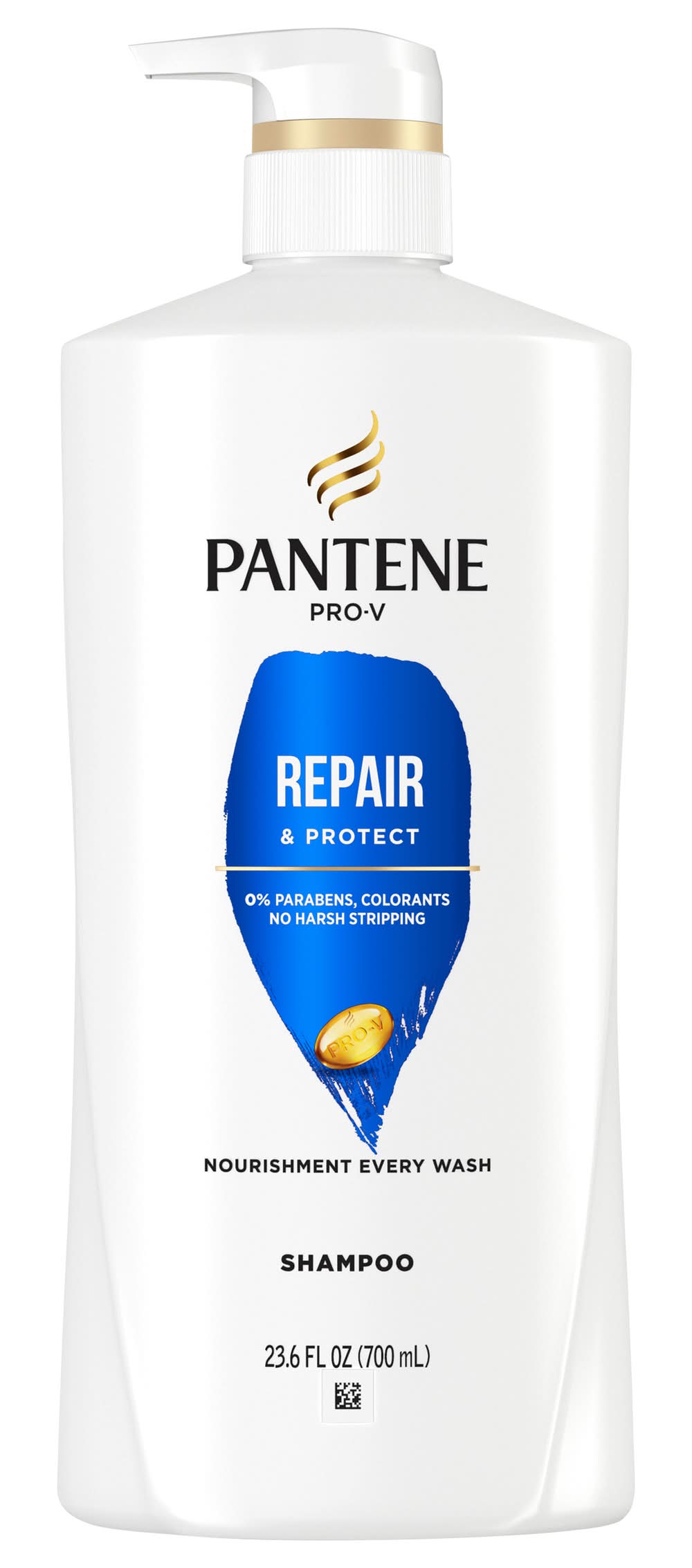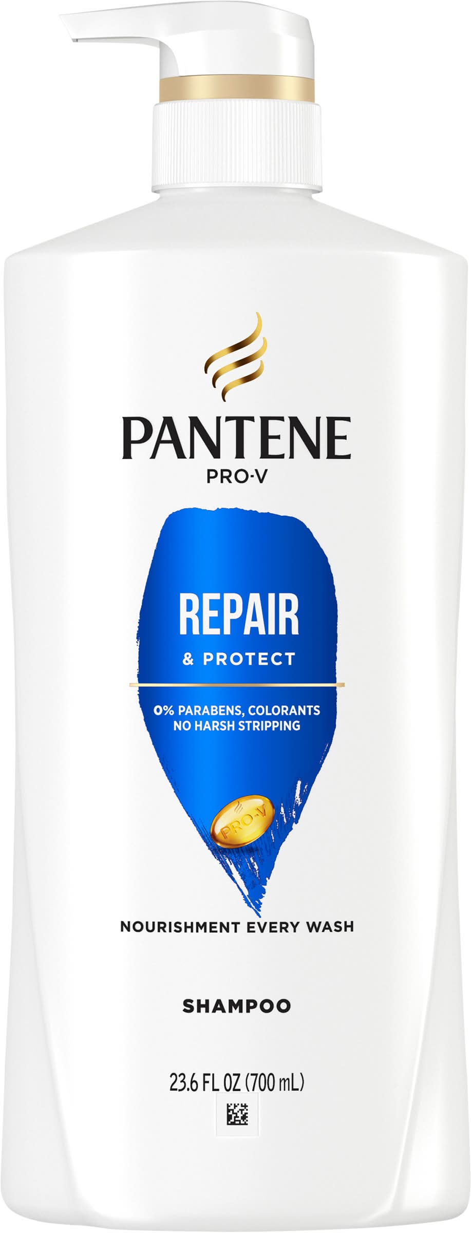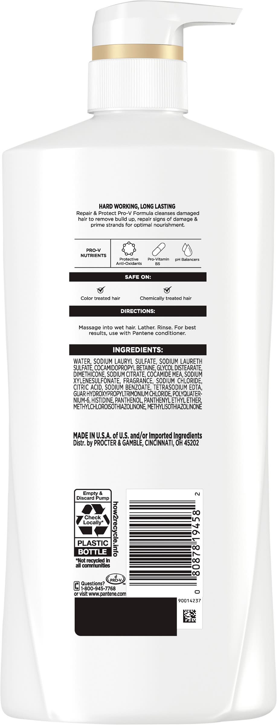 0% parabens, colorants. No harsh stripping. Nourishment every wash. Hard working, long lasting. Repair & Protect Pro-V formula cleanses damaged hair to remove build up, repair signs of damage & prime strands for optimal nourishment. Pro-V Nutrients: Protective anti-oxidants, Pro-Vitamin B5, pH balancers. Safe on: Color treated hair, chemically treated hair. how2recycle.info. www.pantene.com. Questions? 1-800-945-7768 or visit www.pantene.com. Made in U.S.A. of U.S. and/or imported ingredients. Packaging: Reusable