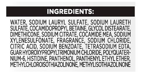 Ingredients: Water, Sodium Lauryl Sulfate, Sodium Laureth Sulfate, Cocamidopropyl Betaine, Glycol Distearate, Dimethicone, Sodium Citrate, Cocamide MEA, Sodium Xylenesulfonate, Fragrance, Sodium Chloride, Citric Acid, Sodium Benzoate, Tetrasodium EDTA, Guar Hydroxypropyltrimonium Chloride, Polyquaternium-6, Histidine, Panthenol, Panthenyl Ethyl Ether, Methylchloroisothiazolinone, Methylisothiazolinone