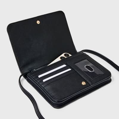 Keep your cell phone secure and close by when you're on the go with the Flap Cell Phone Wallet from A New Day. This snap-closure flap wallet is designed with cellphone, ID and credit card pockets to help meet your needs. Designed with an adjustable strap that allows you to carry it in crossbody style. It Style that goes wherever you do. Color: Black