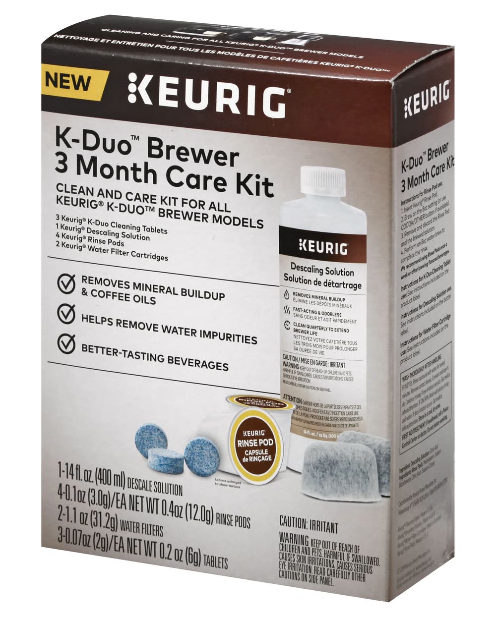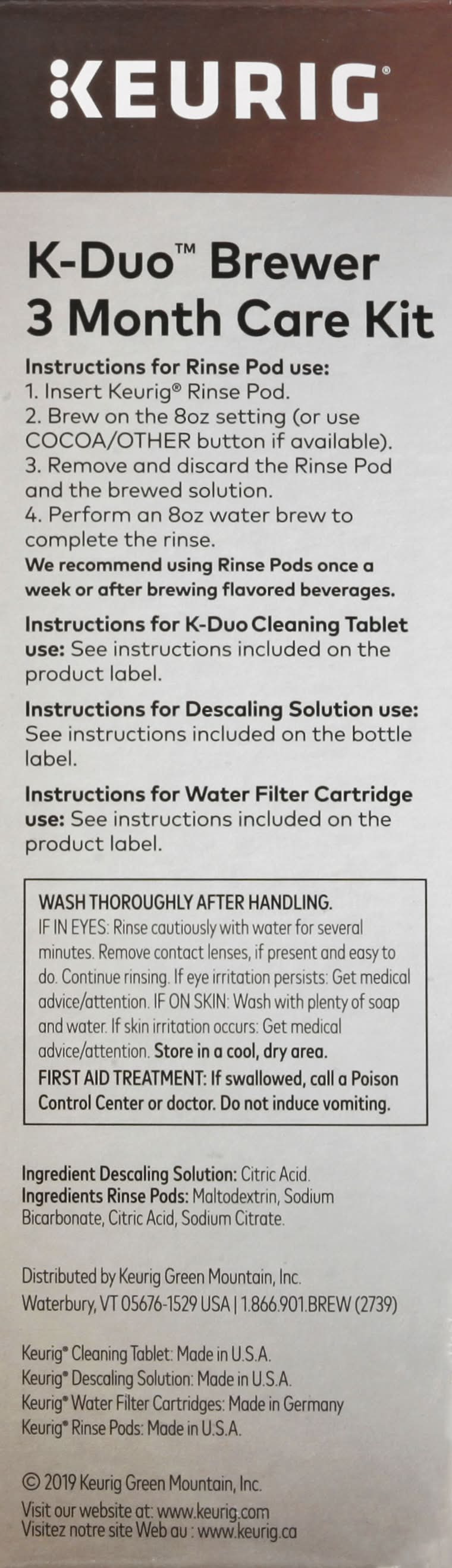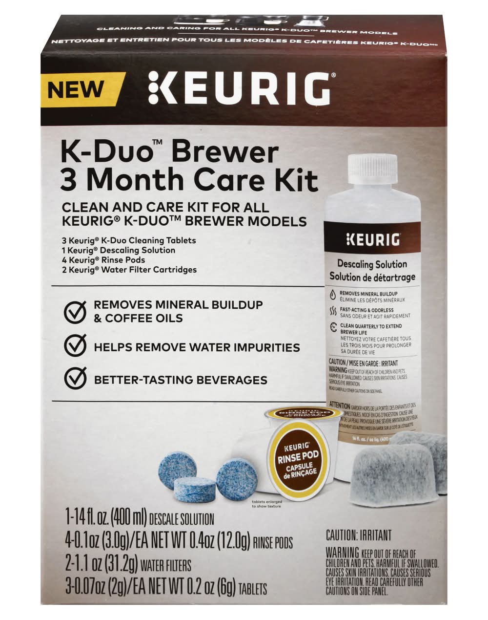 1 - 14 fl. oz. (400 ml) descale solution; 4 - 0.1 oz (3.0g)/ea net wt 0.4 oz (12.0g) rinse pods; 2 - 1.1 oz (31.2g) water filters; 3 - 0.07 oz (2g)/ea net wt 0.2 oz (6g) tablets. Clean and Care Kit for All Keurig K-Duo Brewer Models: 3 Keurig K-Duo cleaning tablets; 1 Keurig descaling solution; 4 Keurig rinse pods; 2 Keurig water filter cartridges. Removes mineral buildup & coffee oils. Helps remove water impurities. Better-tasting beverages. Fast-acting & odorless. Clean quarterly to extend brewer life. Cleaning and caring for all Keurig K-Duo brewer models. www.keurig.com. www.keurig.ca. Visit our website of www.keurig.com. Keurig Cleaning Tablet: Made in USA. Keurig Descaling Solution: Made in USA. Keurig Water Filter Cartridges: Made in Germany. Keurig Rinse Pods: Made in USA.