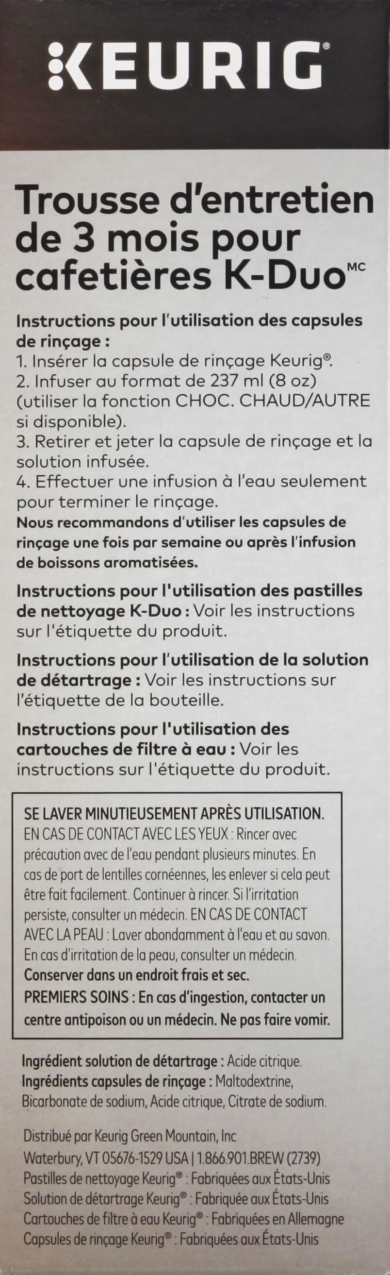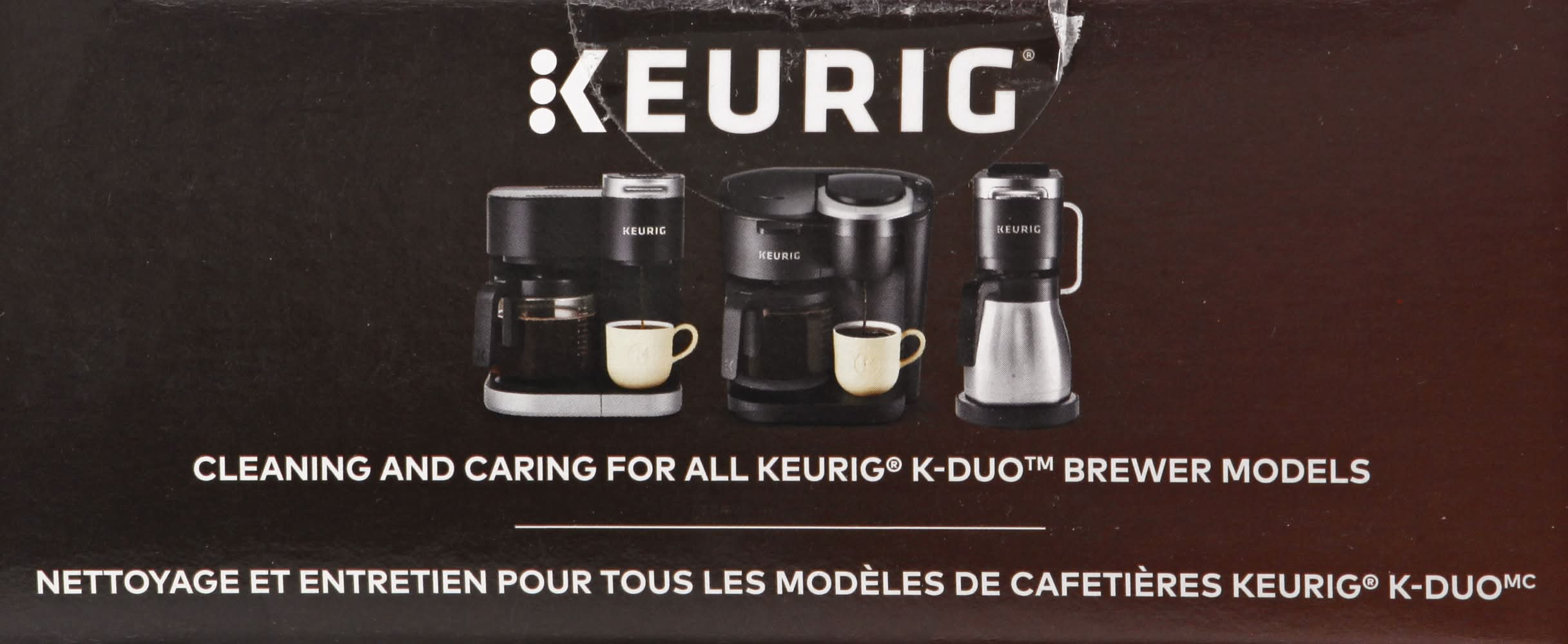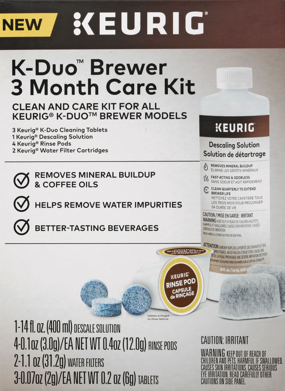 1 - 14 fl. oz. (400 ml) descale solution; 4 - 0.1 oz (3.0g)/ea net wt 0.4 oz (12.0g) rinse pods; 2 - 1.1 oz (31.2g) water filters; 3 - 0.07 oz (2g)/ea net wt 0.2 oz (6g) tablets. Clean and Care Kit for All Keurig K-Duo Brewer Models: 3 Keurig K-Duo cleaning tablets; 1 Keurig descaling solution; 4 Keurig rinse pods; 2 Keurig water filter cartridges. Removes mineral buildup & coffee oils. Helps remove water impurities. Better-tasting beverages. Fast-acting & odorless. Clean quarterly to extend brewer life. Cleaning and caring for all Keurig K-Duo brewer models. www.keurig.com. www.keurig.ca. Visit our website of www.keurig.com. Keurig Cleaning Tablet: Made in USA. Keurig Descaling Solution: Made in USA. Keurig Water Filter Cartridges: Made in Germany. Keurig Rinse Pods: Made in USA.