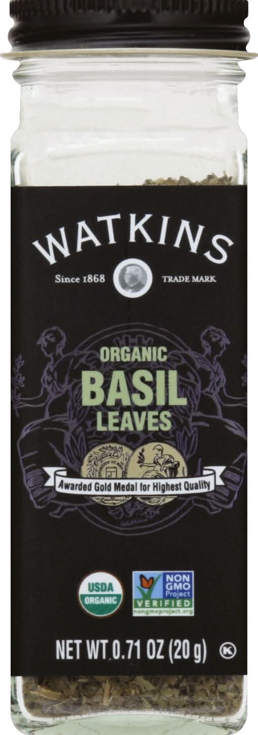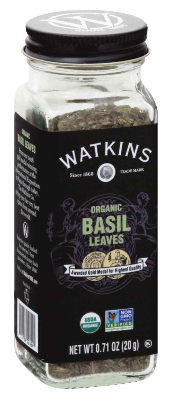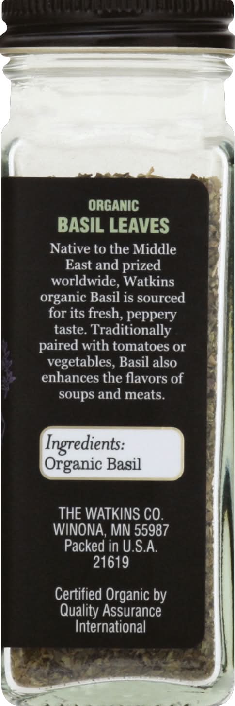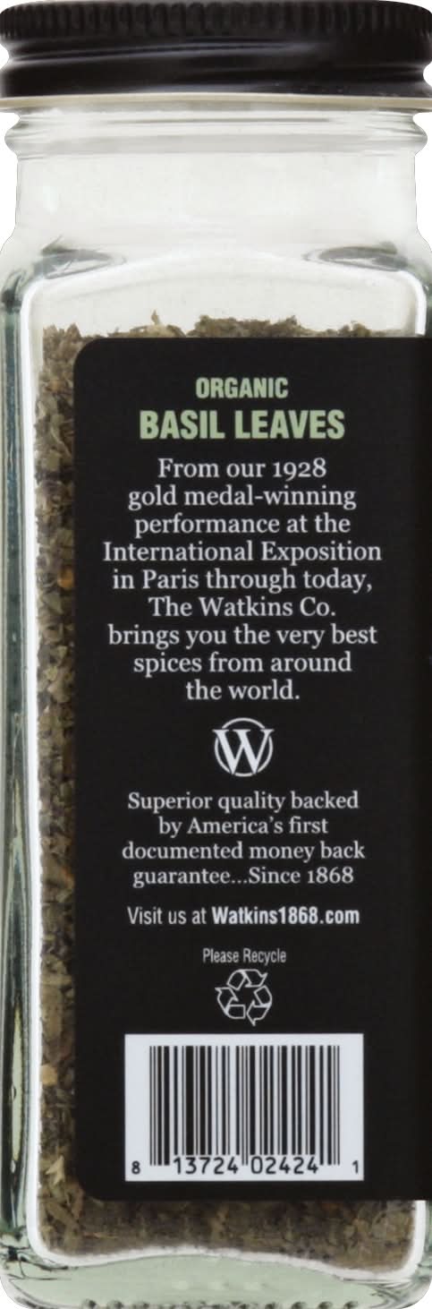 USDA Organic. Certified Organic by Quality Assurance International. Non GMO Project verified. nongmoproject.org. Since 1868. Trade mark. Awarded Gold Medal for highest quality. From our 1928 gold medal-winning performance at the International Exposition in Paris through today, The Watkins Co. brings you the very best spices from around the world. Superior quality backed by America's first documented money back guarantee - since 1868. Native to the Middle East and prized worldwide, Watkins organic Basil is sourced for its fresh, peppery taste. Traditionally paired with tomatoes or vegetables, Basil also enhances the flavors of soups and meats. Visit us at Watkins1868.com. Please recycle. Packed in USA. • The Watkins Co., • Packaging: Reusable