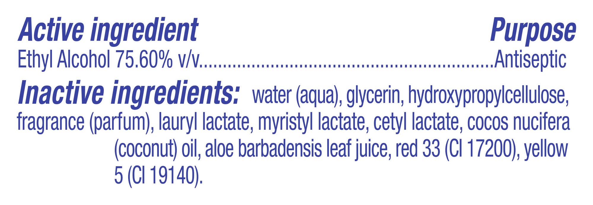 Active Ingredients: Ethyl Alcohol 75.60% v/v Inactive Ingredients: water (aqua), glycerin, hydroxypropylcellulose, fragrance (parfum), lauryl lactate, myristyl lactate, cetyl lactate, cocos nucifera (coconut) oil, aloe barbadensis leaf juice, red 33 (CI 17200), yellow 5 (CI 19140) Contains: None Additives: None