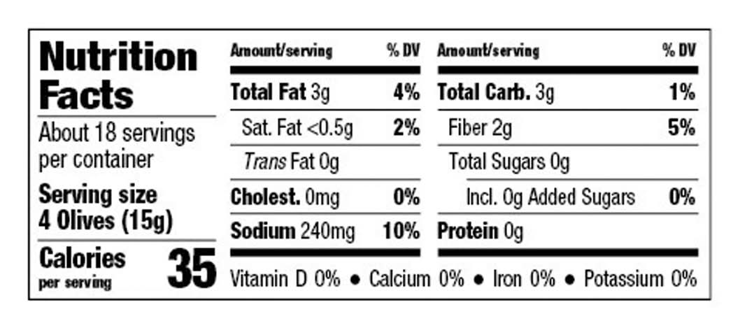Ingredients: Kalamata Olives, Water, Distilled and Red Wine Vinegars, Sea Salt, Olive Oil, Lactic Acid