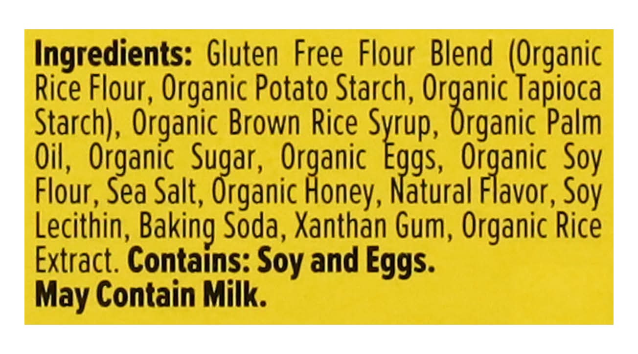 Gluten Free Flour Blend (Organic Rice Flour, Organic Potato Starch, Organic Tapioca Starch), Organic Brown Rice Syrup, Organic Palm Oil, Organic Sugar, Organic Eggs, Organic Soy Flour, Sea Salt, Organic Honey, Natural Flavor, Soy Lecithin, Baking Soda, Xanthan Gum, Organic Rice Extract Contains: Soybeans, Eggs, Milk