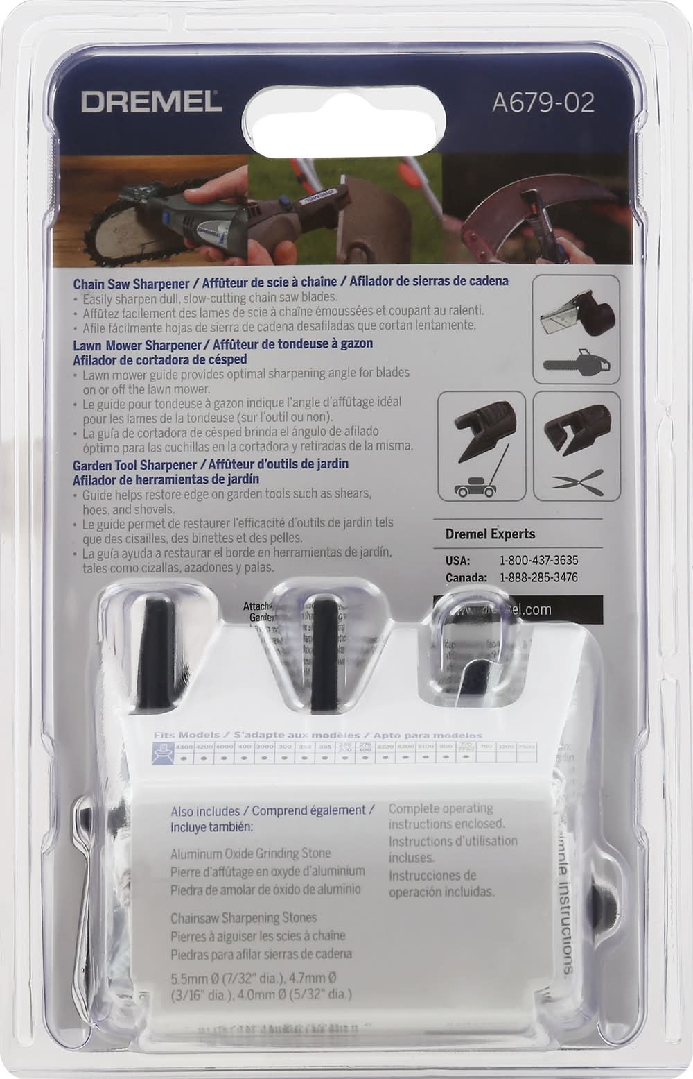 Fits Models: 4300; 4200; 4000; 400; 3000; 300; 398; 395; 285/200; 275/100; 8220; 8200; 8100; 800; 770/7700. Tool not included. Chain Saw Sharpener: Easily sharpen dull, slow-cutting chain saw blades. Lawn Mower Sharpener: Lawn mower guide provides optimal sharpening angle for blades on or off the lawn mower. Garden Tool Sharpener: Guide helps restore edge on garden tools such as shears, hoes, and shovels. Also Includes: aluminum oxide grinding stone; chainsaw sharpening stones; 5.5 mm (7/32 inch dia), 4.7 mm (3/16 inch dia), 4.0 mm (5/32 inch dia). Complete operating instructions enclosed. www.dremel.com. Dremel Experts: USA: 800-437-3635. Canada: 888-285-3476. Dremel,