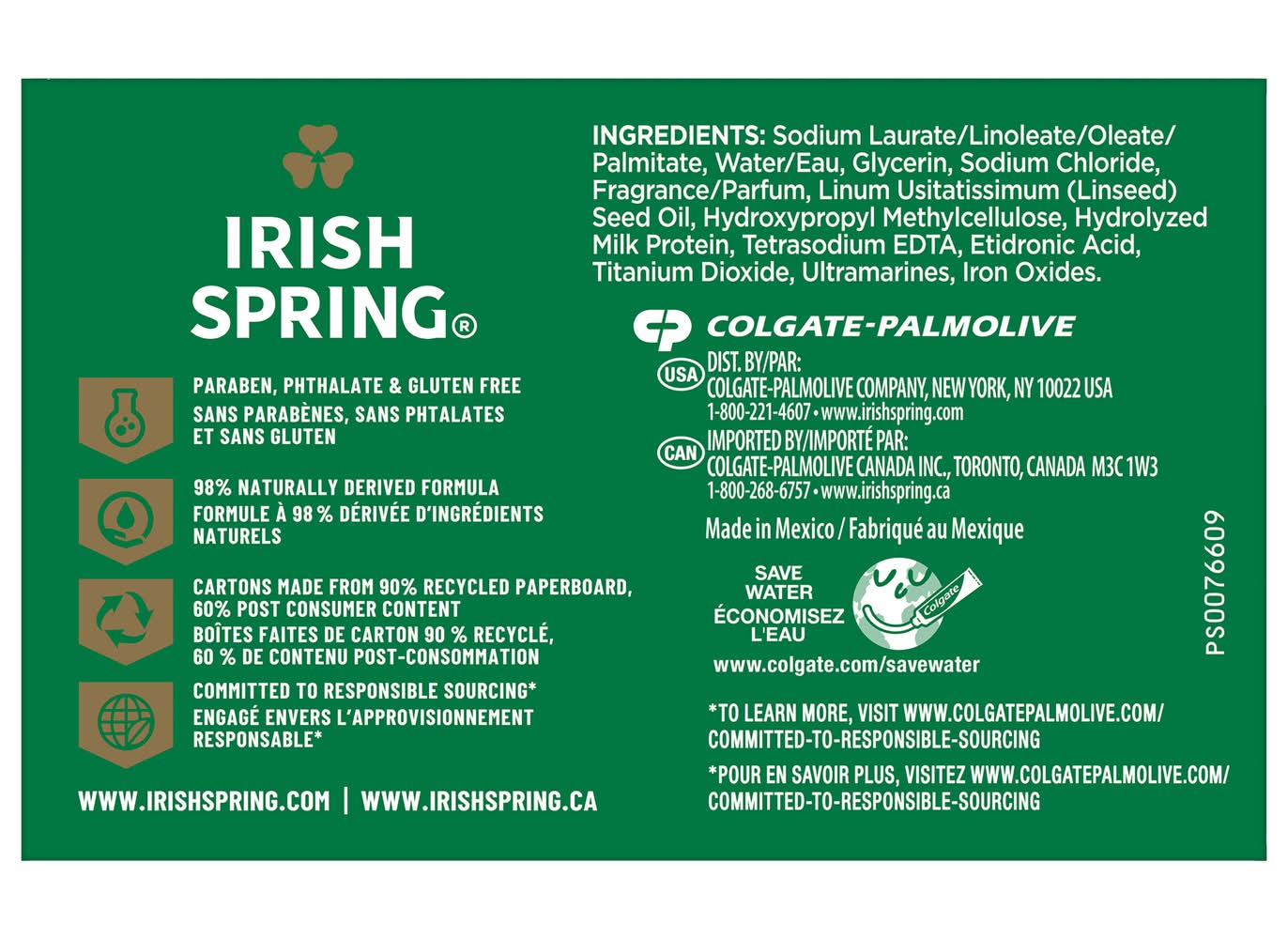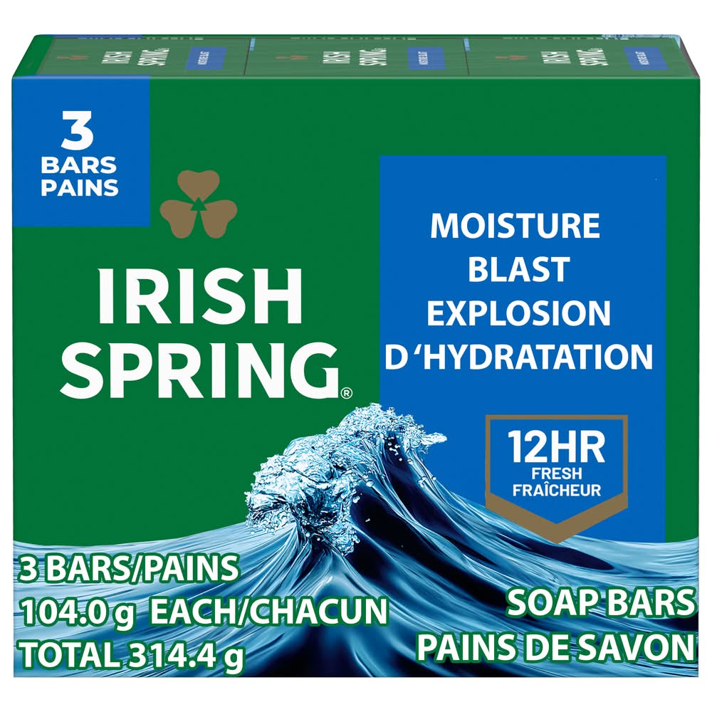Irish Spring Moisture Blast Deodorant Bar Soap, 3 Pack Smell like you came from a nice-smelling place with Irish Spring Bar Soap. Irish Spring Moisture Blast bar soap provides deep moisturization and is made with a 98% naturally derived formula. Count on Irish Spring Bar Soap to leave your skin feeling clean — our bar soap for men keeps you fresh for 12 hours. Fresh Look, Great Smell Feel clean, smell serene with the new Irish Spring. Our recyclable carton might have a new design, but it’s still the same great bar soap you love. Our packaging refresh is all part of our master plan to bring the amazing places you love to smell straight to your bathroom. Get as fresh as the great outdoors and add some adventure to your everyday with the whole line of body washes and bar soaps for men. We want you to smell as great as you feel, so you can focus on moments that turn into memories. Bar Soap for Body and Hands Irish Spring Bar Soap has a sudsy lather that washes away bacteria, so you can use it as a hand soap bar and keep the fresh smell going all day long. Plus, this soap bar is mild for skin. It’s paraben, phthalate and gluten free and has flaxseed oil. Feel good while washing your hands and body with Irish Spring. Irish Spring Bar Soap Pack Never go without smelling your best. The Irish Spring bar soap pack is conveniently packaged so that you can stock up. Keep some in your bathroom, in the pantry, give some to your friends and keep the good smells going.