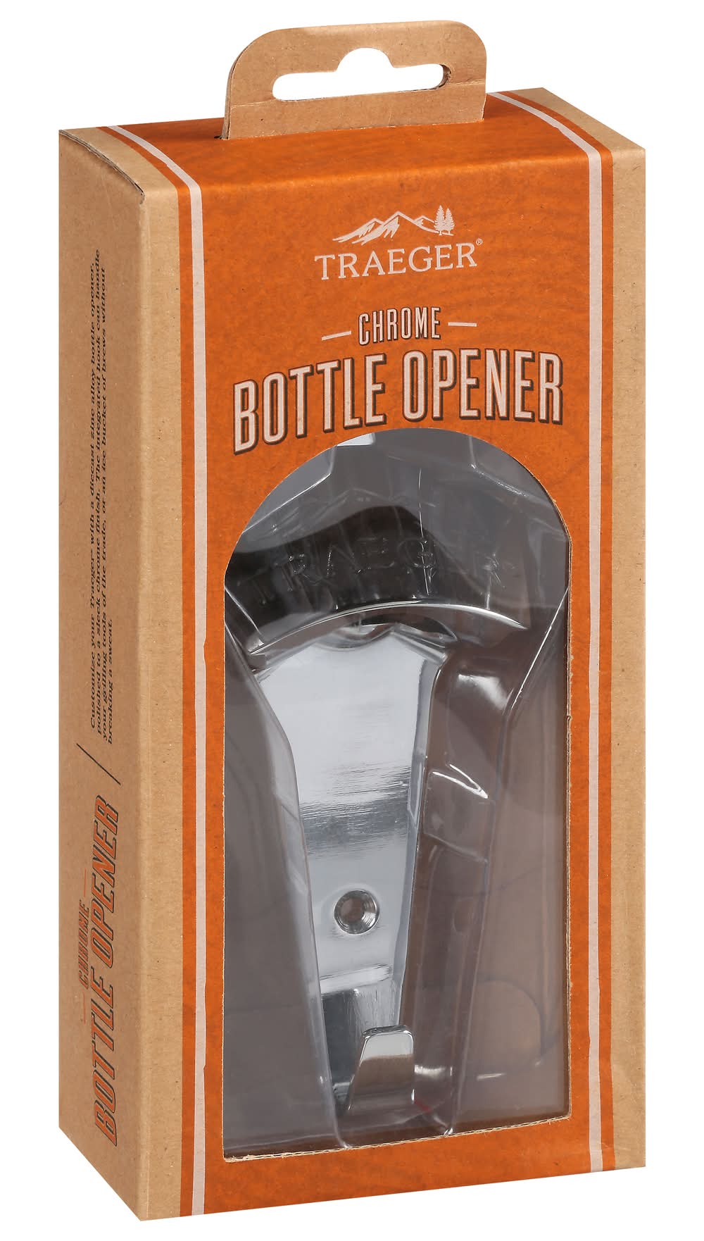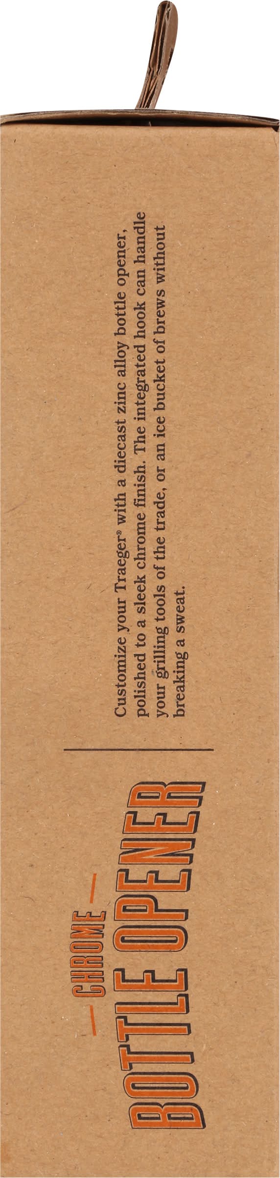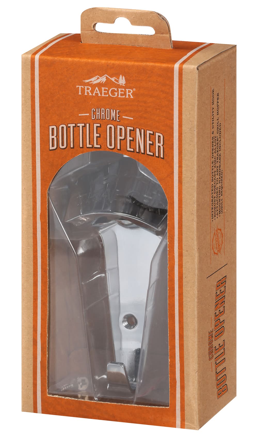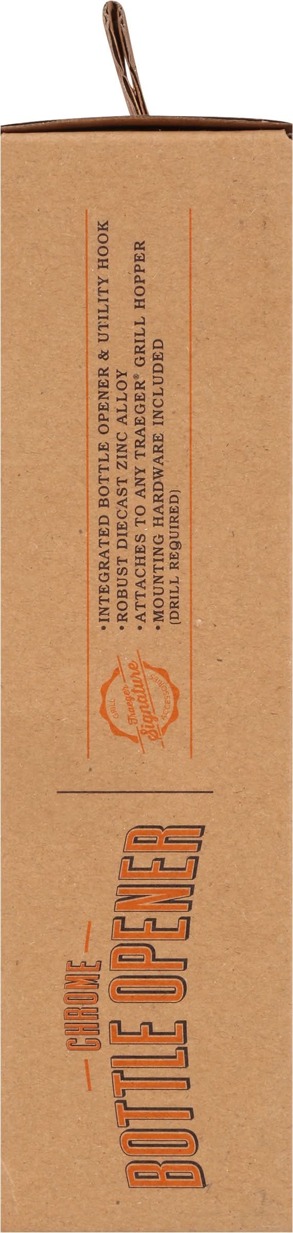 Customize your Traeger with a diecast zinc alloy bottle opener, polished to a sleek chrome finish. The integrated hook can handle your grilling tools of the trade, or an ice bucket of brews without breaking a sweat. Grill Accessories thaeger Signature. Integrated bottle opener and utility hook. Robust diecast zinc alloy. Attaches to any Traeger grill hopper. Mounting hardware included (Drill required). Taste the difference. www.traegergrills.com. Instagram. YouTube. Facebook. Twitter. Pinterest. Google+ . (hashtag)traegergrills. Please recycle. Made in China. Traeger Pellet Grills, LLC,