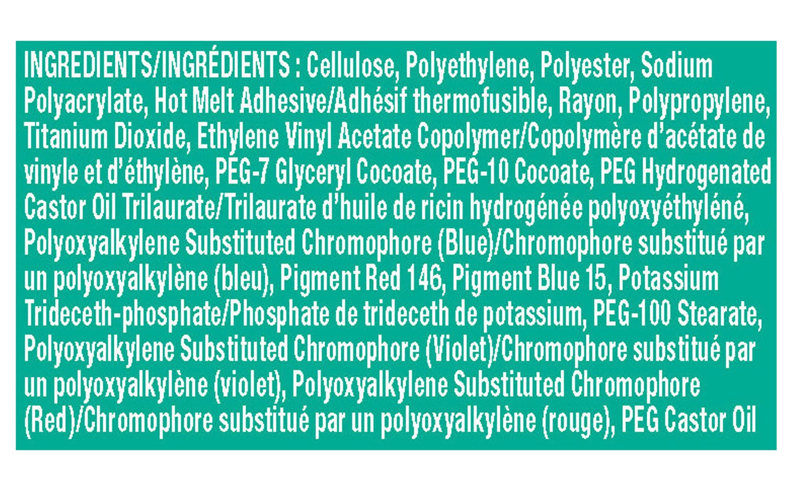 Ingredients: Cellulose, Polyethylene, Polyester, Sodium Polyacrylate, Hot Melt Adhesive/Adhesif Thermofusible, Rayon, Polypropylene, Titanium Dioxide, Ethylene Vinyl Acetate Copolymer/Copolymere D'acetate De Vinyle Et D'ethylene, PEG-7 Glyceryl Cocoate, PEG-10 Cocoate, PEG Hydrogenated Castor Oil Trilaurate/Trilaurate D'huile De Ricin Hydrogenee Polyoxyethylene, Polyoxyalkylene Substituted Chromophore (Blue)/Chromophore Substitue Par Un Polyoxyalkylene (Bleu), Pigment Red 146, Pigment Blue 15, Potassium Trideceth-Phosphate/Phosphate De Trideceth De Potassium, PEG-100 Stearate, Polyoxyalkylene Substituted Chromophore (Violet)/Chromophore Substitue Par Un Polyoxyalkylene (Violet), Polyoxyalkylene Substituted Chromophore (Red)/Chromophore Substitue Par Un Polyoxyalkylene (Rouge), PEG Castor Oil