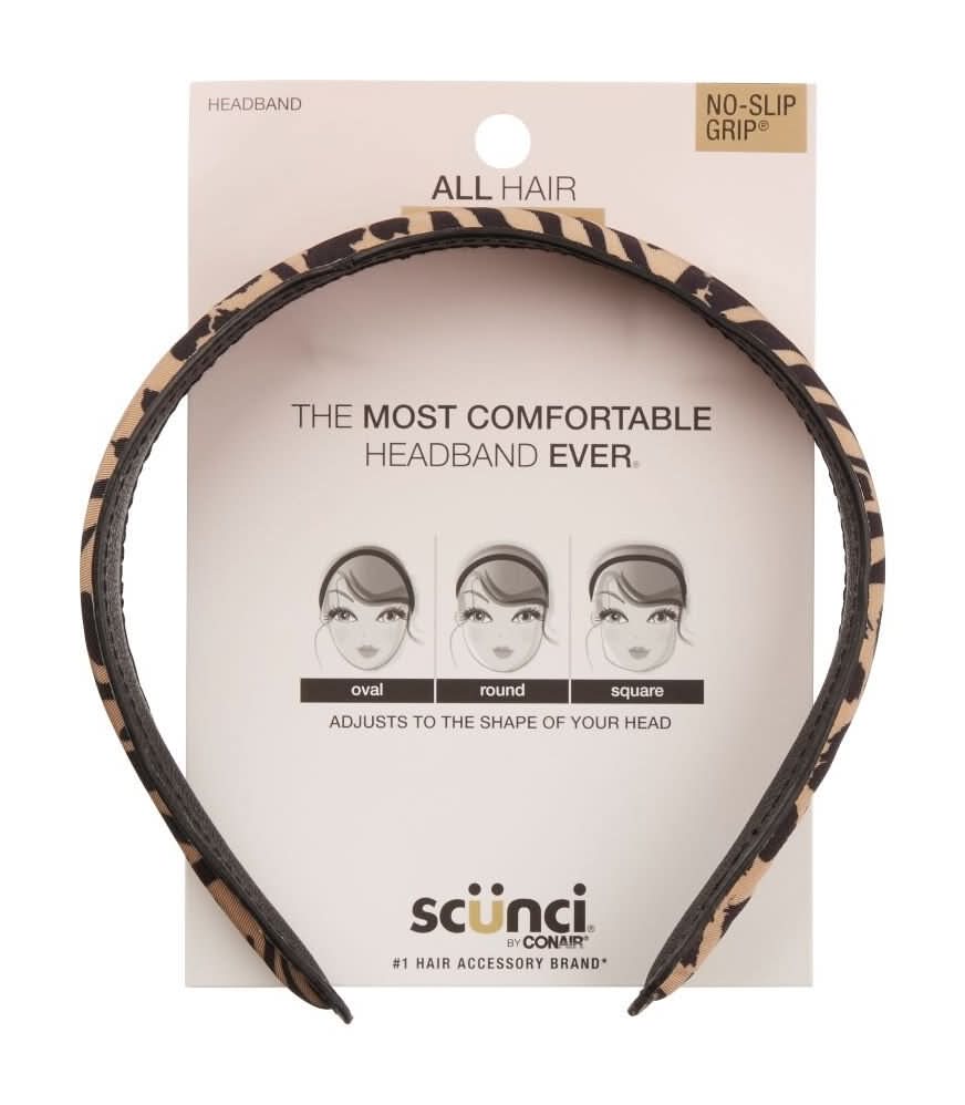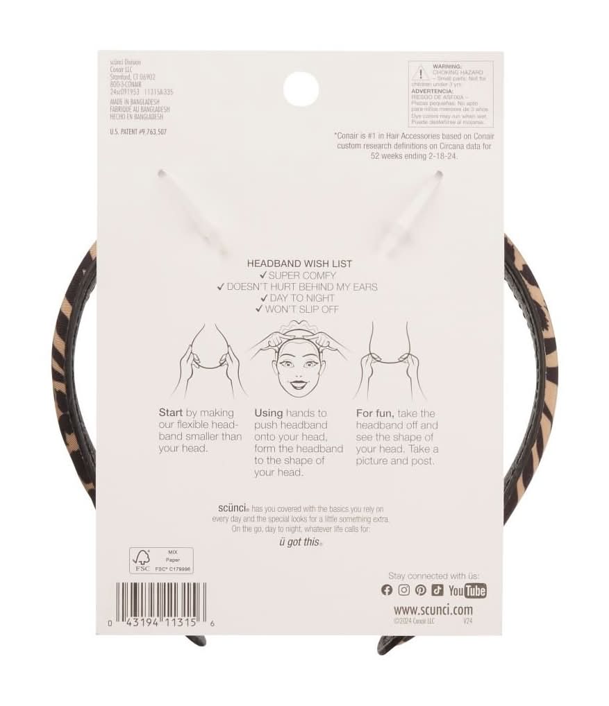 Seamlessly blend fashion with everyday comfort when you wear The Most Comfortable Headband Ever from the scunci Innovation collection. This chic leopard print satin headband has an adjustable design that conforms to your head shape for all-day hold with No-Slip Grip. Ideal for all hair types, it effortlessly ties trend and practicality into your daily essentials. About scünci hair accessories: When it comes to keeping your look on-trend, scünci has you covered with today’s hottest hair accessories, including stylish headbands, super-comfy scrunchies, glitzy bobby pins, glam barrettes, and much more. From work to workouts to nights out, scünci lets you express your personal style and gets you ready for any occasion. Take control of your hair and look amazing whatever you do and wherever you go. Whether bling is your thing or casual is your calling, with scünci, ü got this. The Most Comfortable Headband Ever Leopard print satin Adjusts to fit the shape of your head All-day hold