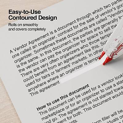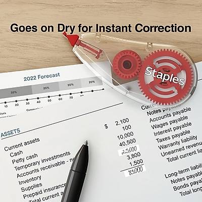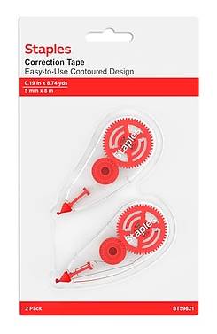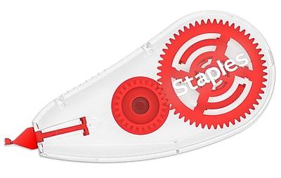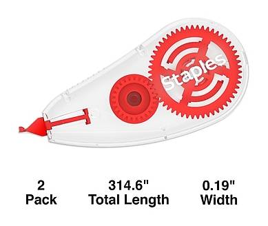 Submit typo-free, professional-quality copies with this two-pack of Staples topwinder correction tapes. Redact confidential information and correct errors on faxes and copies with these topwinder correction tapes. The contoured ergonomic dispensers fit in the hand comfortably to support effortless application. With a fast-dry formulation, the tapes let you rewrite text quickly and make multiple revisions efficiently. These white Staples topwinder correction tapes lay down smoothly and leave no smudges or shadows, effectively hiding a multitude of errors. - Correction tape in ergonomic contoured design fits comfortably in the hand - Rolls on smoothly and covers completely - White tape leaves no shadow on copies and faxes for accurate and professional documents - Goes on dry for instant corrections and immediate writing - Two per pack - Tape size: 0.19 x 26.22' Convenient Dispenser This correction tape comes in a convenient hand dispenser, making it easy to use the tape with finesse. The dispenser holds 315 inches of tape to ensure you don't have to replace it frequently. This convenient plastic tape holder makes it possible for you to throw the correction tape into your briefcase for off-site work without damaging the product. Dual Functionality Use this correction tape to correct individual letters or fix whole sentences. Simply push the dispenser against the page to cover an individual letter or drag it across a sentence to cover the whole line. Quick and Easy Correction The correction tape goes on dry, so you can write or type on the tape immediately after application. You don't have to worry about wasting time waiting for liquid correction fluid to dry or damaging your document with liquid that soaks through.