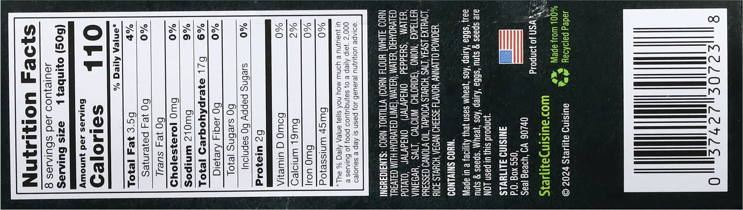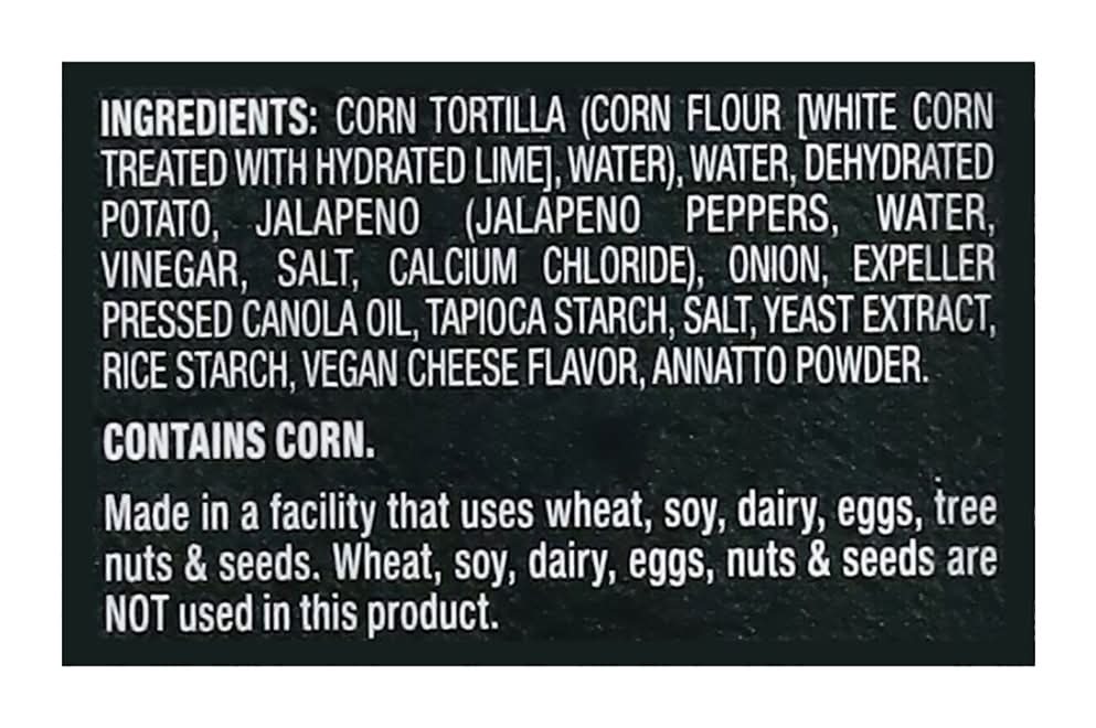 Corn Tortilla (Corn Flour [White Corn Treated with Hydrated Lime], Water), Water, Dehydrated Potato, Jalapeno (Jalapeno Peppers, Water, Vinegar, Salt, Calcium Chloride), Onion, Expeller Pressed Canola Oil, Tapioca Starch, Salt, Yeast Extract, Rice Starch, Vegan Cheese Flavor, Annatto Powder Contains: Corn, Wheat, Soybeans, Milk, Eggs, Tree Nuts