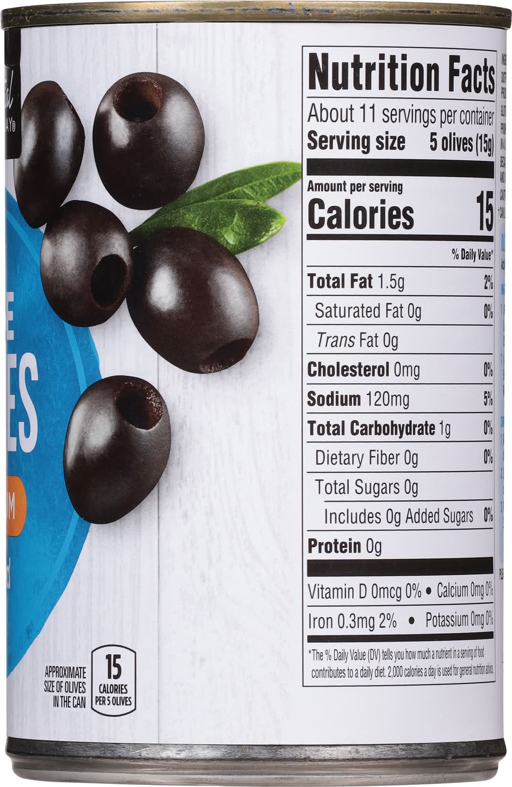 15 calories per 5 olives. Gluten free. Approximate size of olives in the can. Promptly refrigerate unused portion in original brine in a loosely covered glass or plastic container. Because olives are rich in olive oil, it may occasionally appear and solidify in the can and brine and on the olives. 100% Quality Guaranteed: Like it or let us make it right. That's our quality promise. 877.932-7948; essentialeveryday.com. essentialeveryday.com. For additional recipes, visit www.essentialeveryday.com. Non-BPA lining (Can liner not derived from bisphenol-A (BPA)). Please recycle. Product of USA.