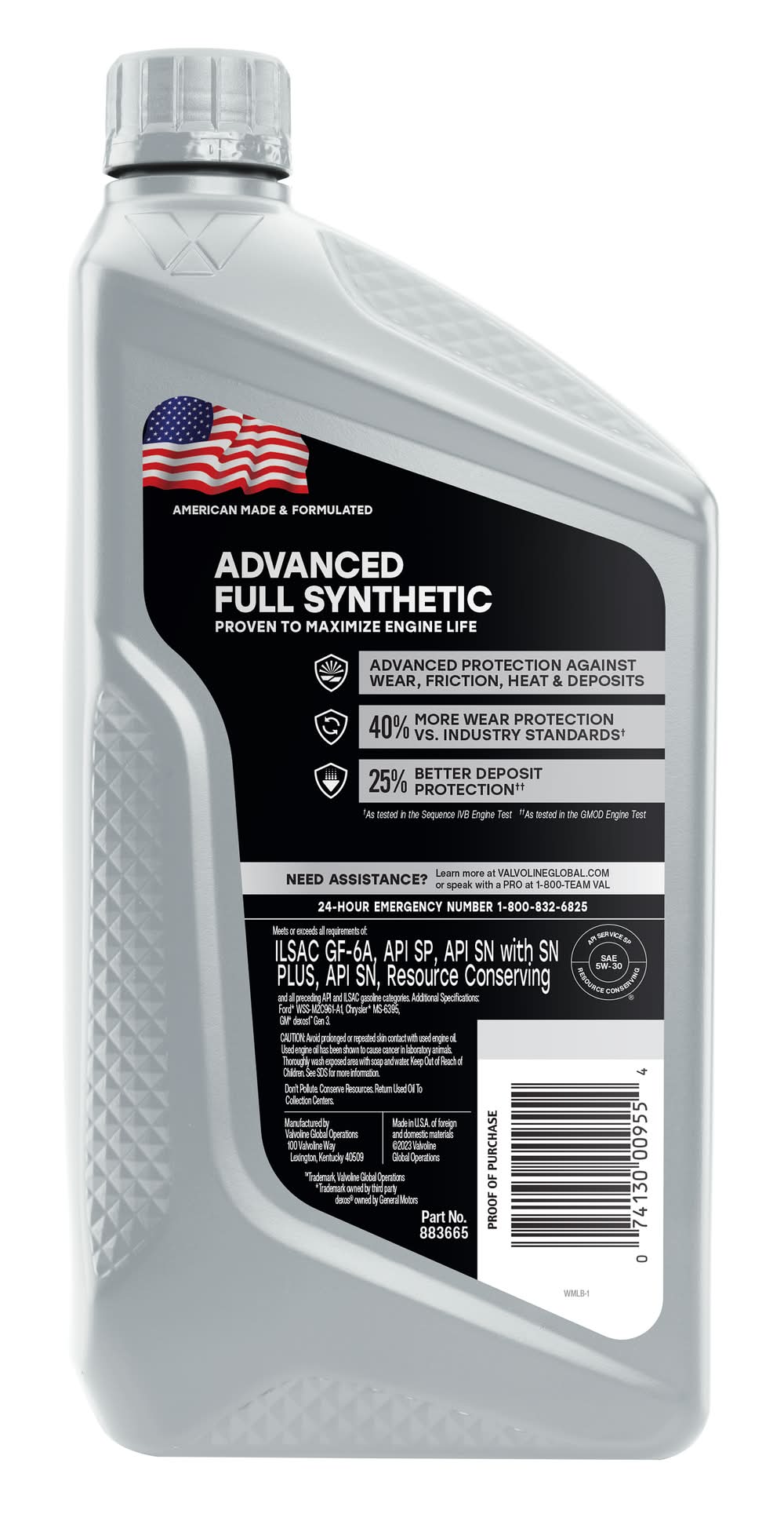Valvoline Full Synthetic 5W-30 Motor Oil is designed to maximize engine life and provide advanced protection for gasoline engines. It meets or exceeds the standards of various specifications, including those set by the American Petroleum Institute and the International Lubricants Standardization and Approval Committee. It offers enhanced wear protection and improved deposit control, contributing to the overall health and efficiency of the engine. Manufactured in the USA with a blend of foreign and domestic materials, it is suited for a wide range of vehicle makes and models. • Valvoline Llc, 100 Valvoline Way,Lexington,Kentucky,40509 • Packaging: Reusable