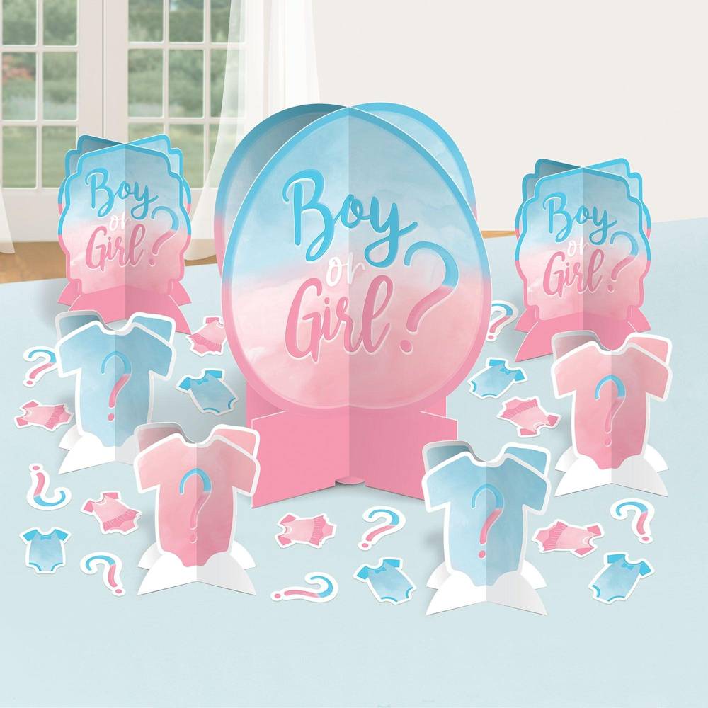 This gender reveal-themed table decorating kit includes blue and pink centerpieces in three sizes. The matching table scatter is shaped like bodysuits and questions marks to bring the look together. Product details 27-piece decorating kit Includes 1 large centerpiece, 12.8in tall 2 medium centerpieces, 7in tall small centerpieces, 4.3in tall 20 pieces of table scatter, 2in tall Simple assembly required Cardstock