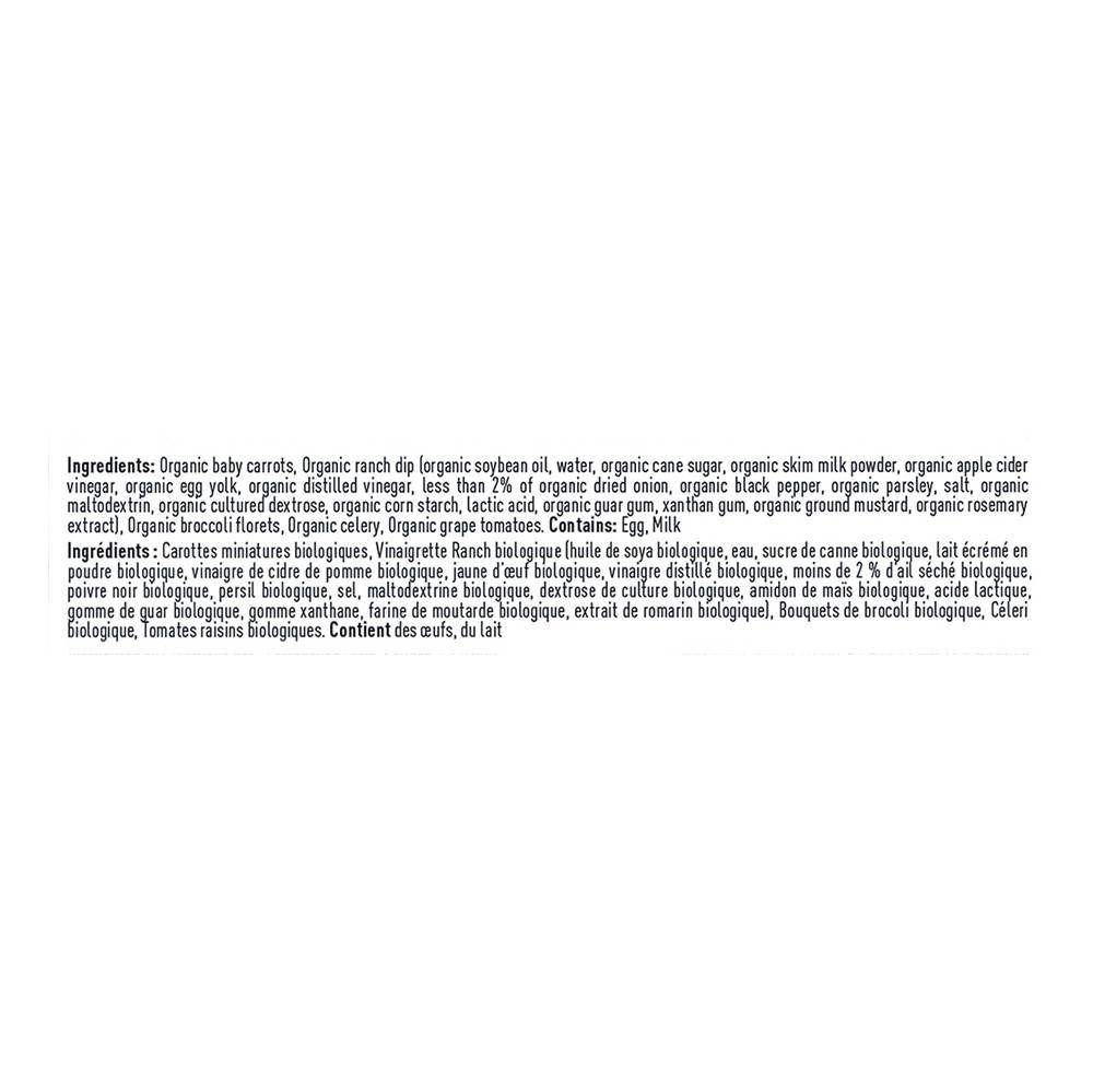 Organic Baby Carrots, Organic Ranch Dip (Organic Soybean Oil Water Organic Cane Sugar Organic Skim Milk Powder Organic Apple Cider Vinegar Organic Egg Yolk Organic Distilled Vinegar Less than 2% of Organic Dried Onion Organic Black Pepper Organic Parsley Salt Organic Maltodextrin Organic Cultured Dextrose Organic Corn Starch Lactic Acid Organic Guar Gum Xanthan Gum Organic Ground Mustard Organic Rosemary Extract), Organic Broccoli Florets, Organic Celery, Organic Grape Tomatoes Contains: Eggs, Milk, Soybeans