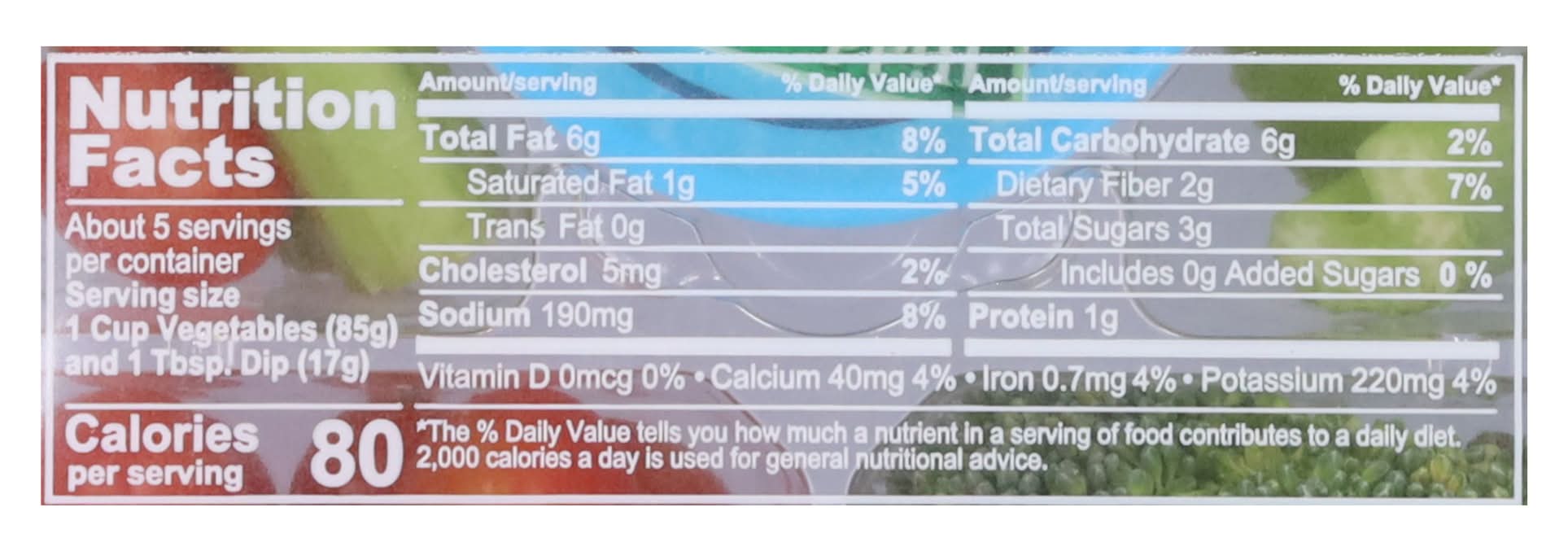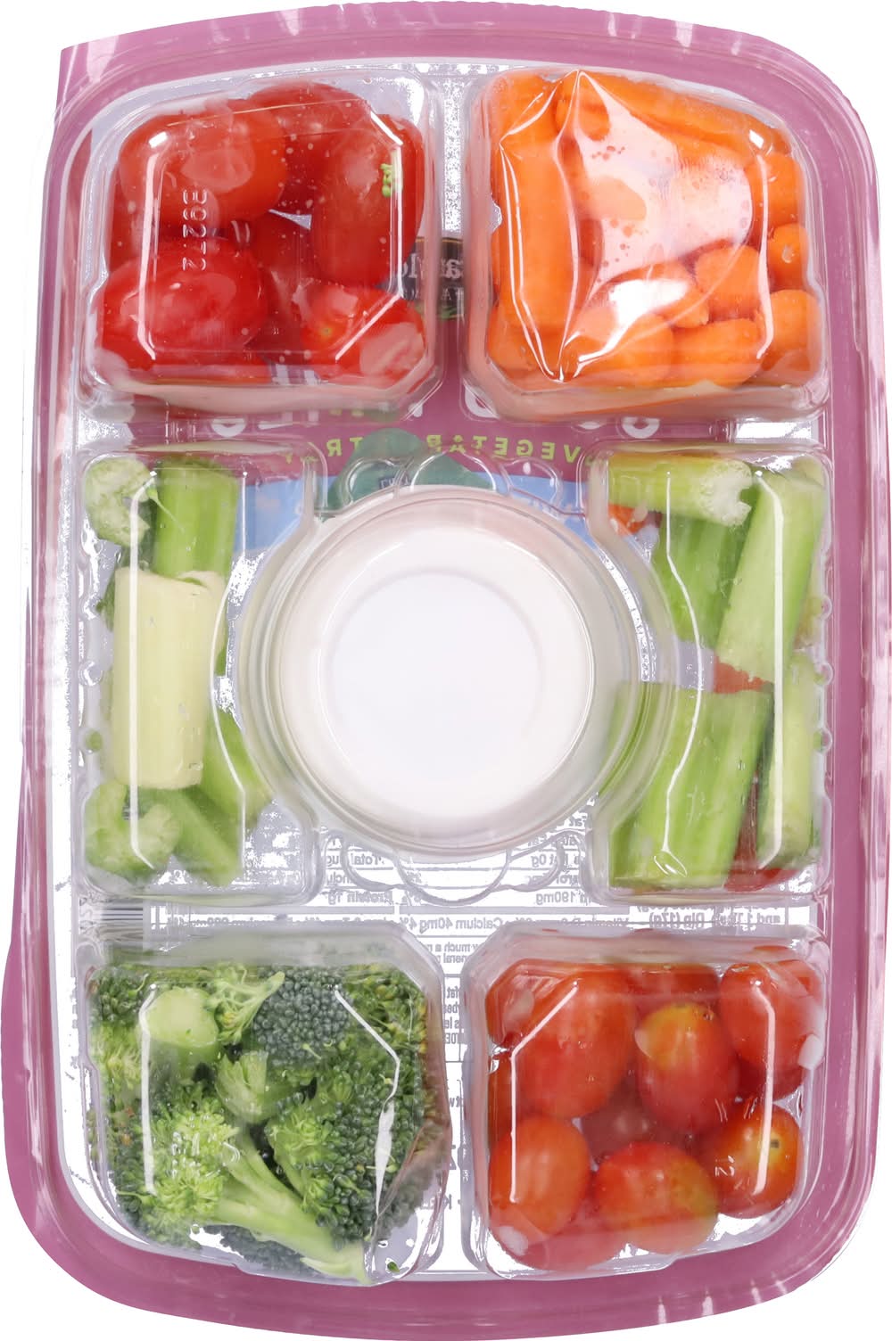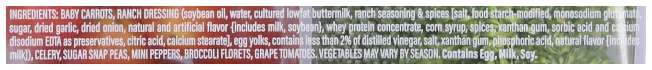Baby Carrots, Ranch Dressing (Soybean Oil, Water, Cultured Lowfat Buttermilk, Ranch Seasoning & Spices [Salt, Food Starch-Modified, Monosodium Glutamate, Sugar, Dried Garlic, Dried Onion, Natural and Artificial Flavor {Includes Milk, Soybean}, Whey Protein Concentrate, Corn Syrup, Spices, Xanthan Gum, Sorbic Acid and Calcium Disodium EDTA as Preservatives, Citric Acid, Calcium Stearate], Egg Yolks, Contains Less than 2% of Distilled Vinegar, Salt, Xanthan Gum, Phosphoric Acid, Natural Flavor [Includes Milk]), Celery, Sugar Snap Peas, Mini Peppers, Broccoli Florets, Grape Tomatoes, Vegetables May Vary by Season Contains: Eggs, Milk, Soybeans, Corn, Celery