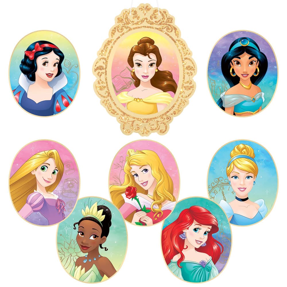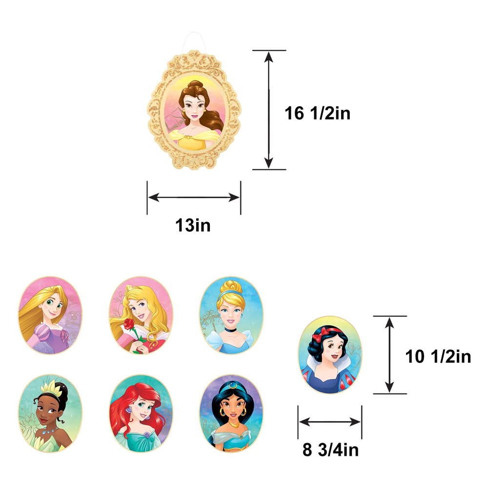 Turn your home into a royal castle by decorating with a Glitter Disney Once Upon a Time Princess Portrait Kit. Included are portraits of Ariel, Aurora, Belle, Cinderella, Jasmine, Rapunzel, Snow White, and Tiana. Have the guest of honor choose which Disney Princess they'd like displayed in the elegant gold frame and hang it up for all to see. pbGlitter Disney Once Upon a Time Princess Portrait Kit includes:/b/p ul liFrame, 13in wide x 16 1/2in tall/li li8 portraits, 8 3/4in wide x 10 1/2in tall/li liFoam adhesive strips/li /ul pOfficially licensed Disney product./p