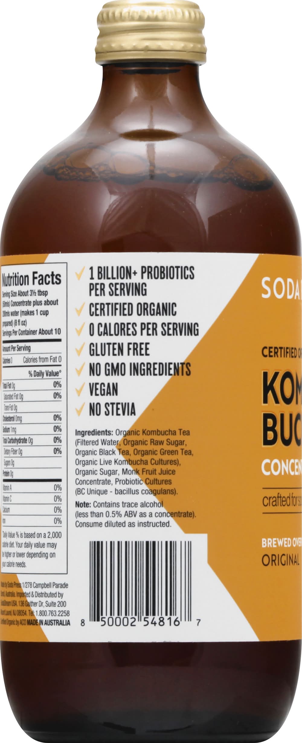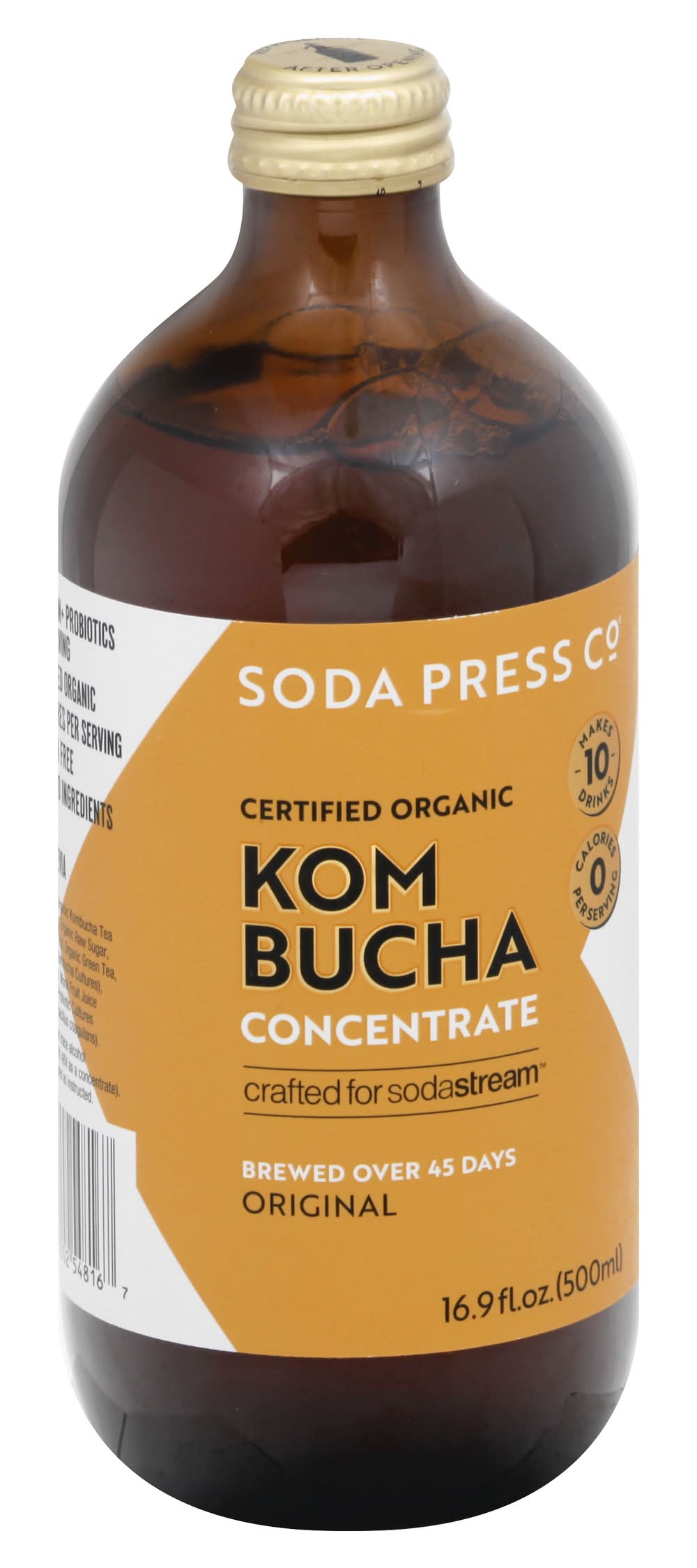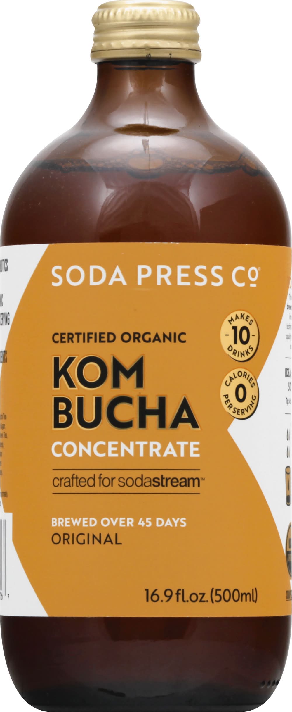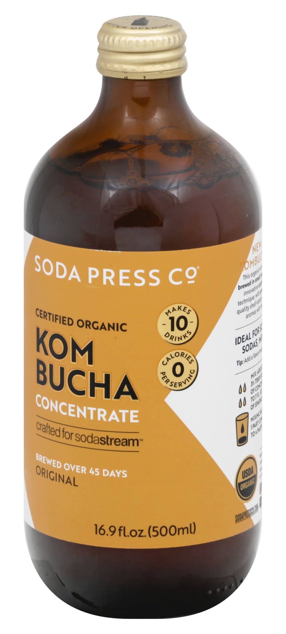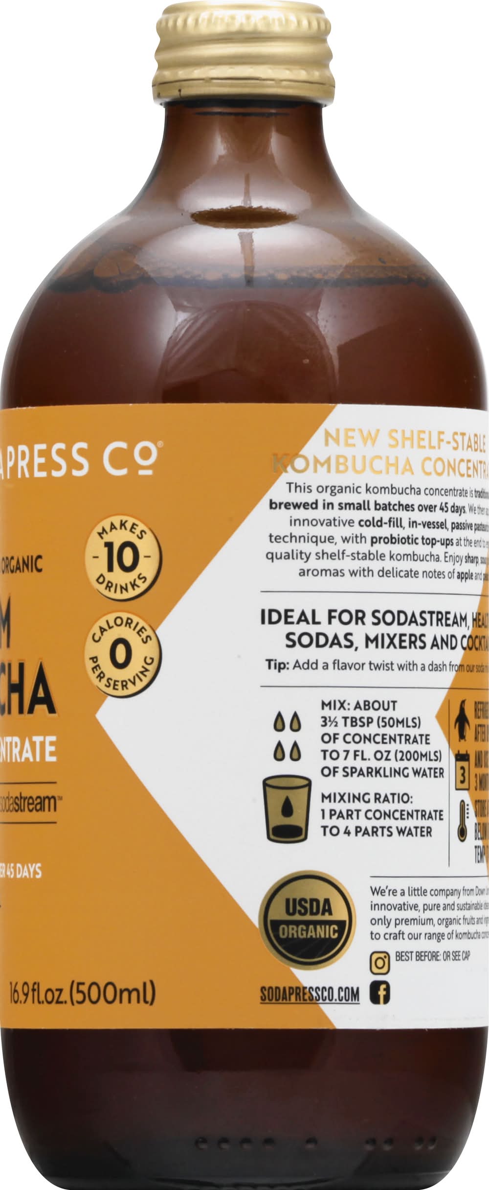 0 calories per serving. 1 billion + probiotic per serving. Certified organic. USDA Organic. Certified Organic by ACO. Gluten free. Vegan. No GMO ingredients. Makes 10 drinks. Crafted for sodastream. Brewed over 45 days. No stevia. New Shelf-Stable Kombucha Concentrate: This organic kombucha concentrate is traditionally brewed in small batches over 45 days. We then apply an innovative cold-fill, in-vessel, passive pasteurizing technique, with probiotic top-ups at the end to ensure a quality shelf-stable kombucha. Enjoy sharp, sour, punchy aromas with delicate notes of apple and peach. We're a little company from down under with innovative, pure and sustainable ideas. We use only premium, organic fruits and ingredients to craft our range of kombucha concentrates. sodapressco.com. Instagram. Facebook. Tel: 1.800.763.2258. Made in Australia. Sodastream, Mount Laurel, NJ, 08054, Ph: 800-763-2258