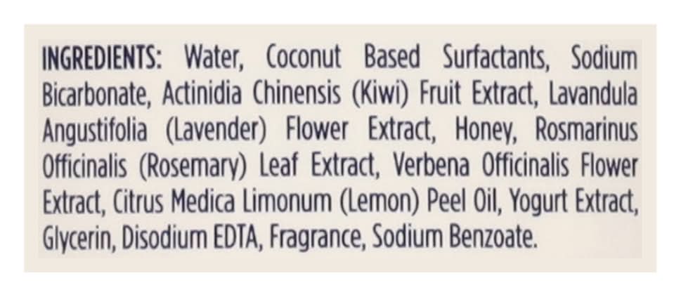 Water, Coconut Based Surfactants, Sodium Bicarbonate, Actinidia Chinensis (Kiwi) Fruit Extract, Lavandula Angustifolia (Lavender) Flower Extract, Honey, Rosmarinus Officinalis (Rosemary) Leaf Extract, Verbena Officinalis Flower Extract, Citrus Medica Limonum (Lemon) Peel Oil, Yogurt Extract, Glycerin, Disodium EDTA, Fragrance, Sodium Benzoate Contains: 'Contains Soybeans', 'Contains Tree Nuts' Additives: None