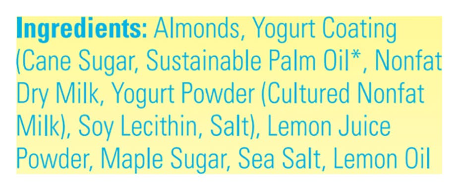 Ingredients: Almonds, Yogurt Coating (Cane Sugar, Palm Kernel Oil (a), Nonfat Dry Milk, Yogurt Powder (Cultured Nonfat Milk), Soy Lecithin**, Salt), Lemon Juice Powder, Maple Sugar, Sea Salt, Lemon Oil. (a) RSPO Certified Source. **Non-GMO Source Contains: Tree Nuts, Almonds, Soybeans, Milk, Peanuts, Tree Nuts
