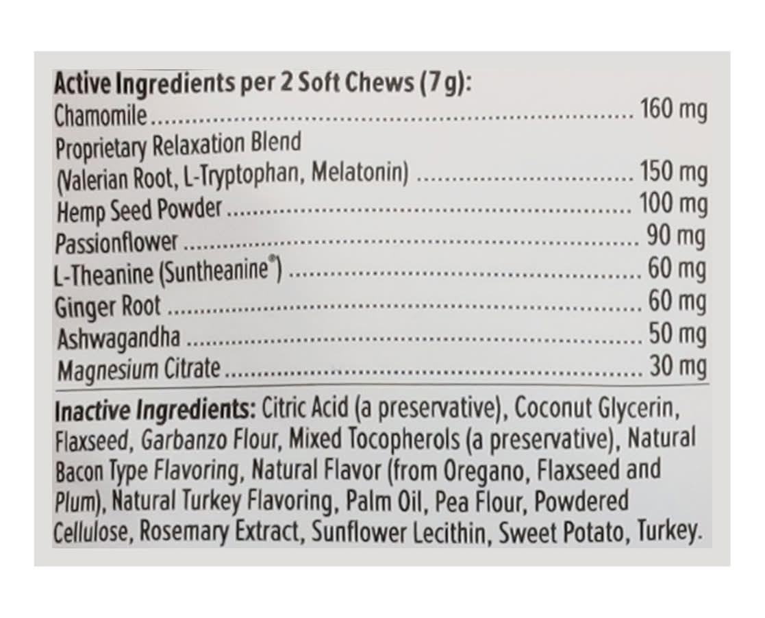 Ingredients: Proprietary Blend: Valerian Root, L-Tryptophan, Melatonin. Inactive Ingredients: Citric Acid (a Preservative), Coconut Glycerin, Flaxseed, Garbanzo Flour, Mixed Tocopherols (a Preservative), Natural Bacon Type Flavoring, Natural Flavor (from Oregano, Flaxseed and Plum), Natural Turkey Flavoring, Palm Oil, Pea Flour, Powdered Cellulose, Rosemary Extract, Sunflower Lecithin, Sweet Potato, Turkey