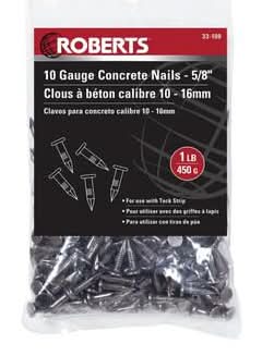 ROBERTS #10 x 5/8 in. Steel Concrete Nails (1 lb. pack) feature heavy-duty 10-Gauge shanks and are ideal for use on hard or aged concrete. These hard nails feature a short and thick shank with excellent piercing and fixing strength. They are manufactured for use with a carpet tack strip over concrete subfloors during carpet installation. Convenient 1 lb. pack easily fits in the tool box. Size: 10x5/8 in