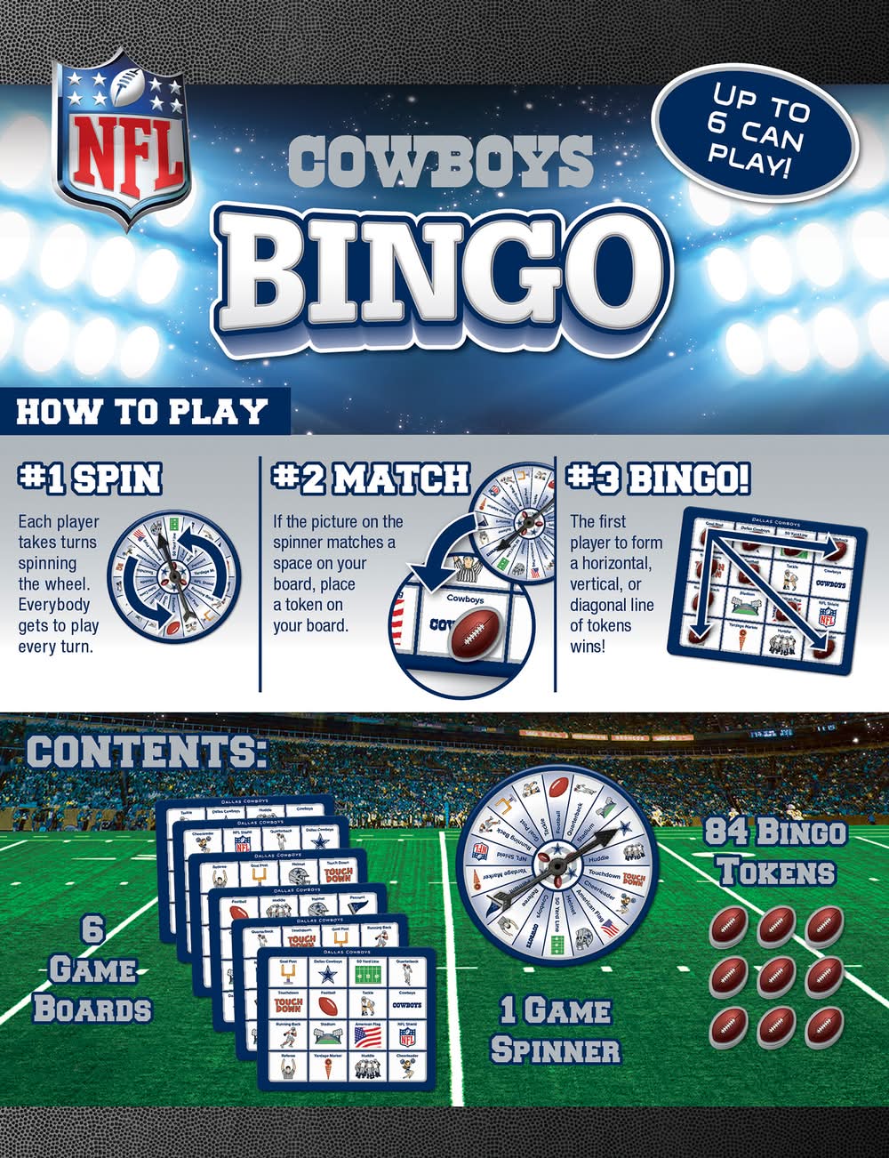 Your MasterPieces Nfl Dallas Cow Boys Bingo Game Set For 6 +Ages delivery options may vary depending on where you are in a city. Enter your address to browse MasterPieces Nfl Dallas Cow Boys Bingo Game Set For 6 +Ages delivery options near you.
