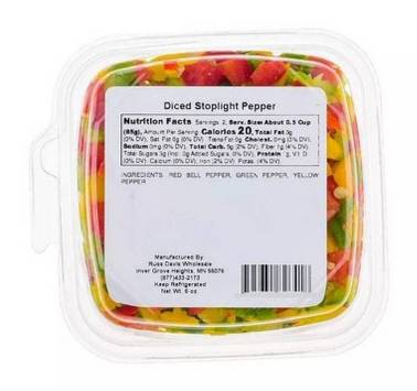 Our Diced Stoplight Peppers contains a mixture of freshly-cut green, red and yellow bell peppers. The blend is a versatile culinary ingredient for everyday dishes. It's also delicious as the main ingredient in salsas, as a topping for nachos or cheese-stuffed baked potatoes and more. Pick up our stoplight peppers and add some color to your dish today!