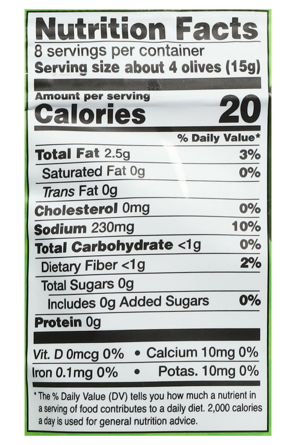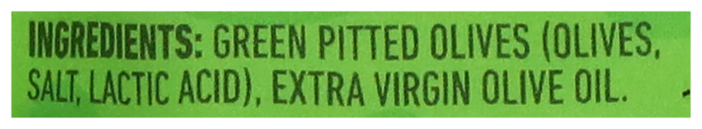 Ingredients: Green Pitted Olives (Olives, Salt, Citric Acid), Extra Virgin Olive Oil