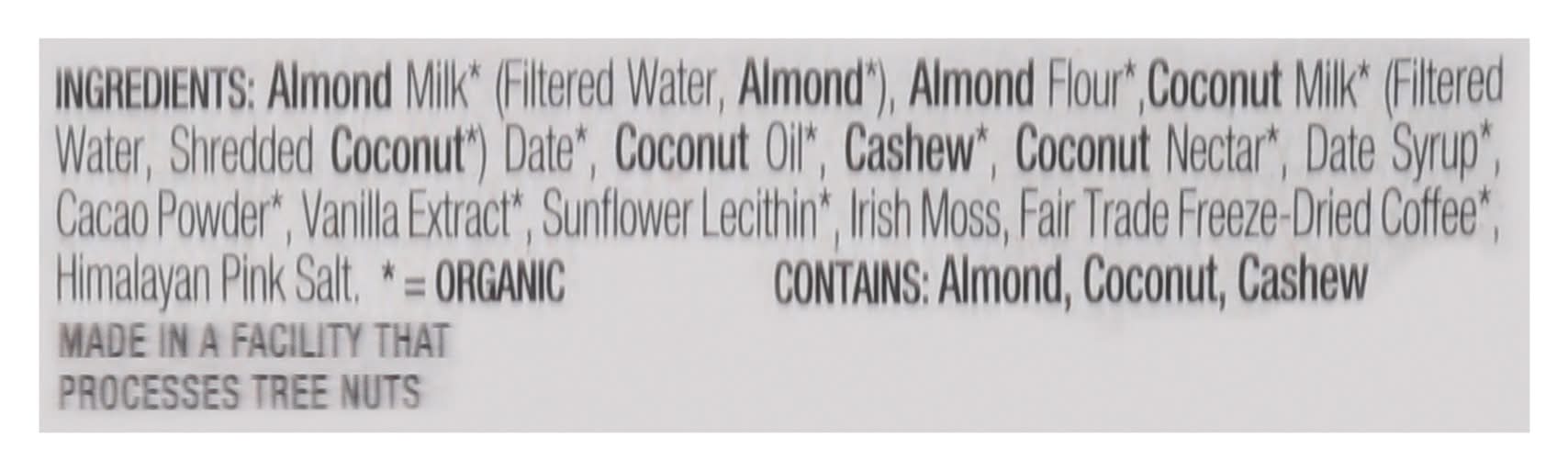Almond Milk* (Filtered Water, Almond*), Almond Flour*, Coconut Milk* (Filtered Water, Shredded Coconut*) Date*, Coconut Oil*, Cashew*, Coconut Nectar*, Date Syrup*, Cacao Powder*, Vanilla Extract*, Sunflower Lecithin*, Irish Moss, Fair Trade Freeze-Dried Coffee*, Himalayan Pink Salt. * = Organic Contains: Tree Nuts, Almonds, Tree Nuts, Coconuts, Tree Nuts, Cashews, Tree Nuts