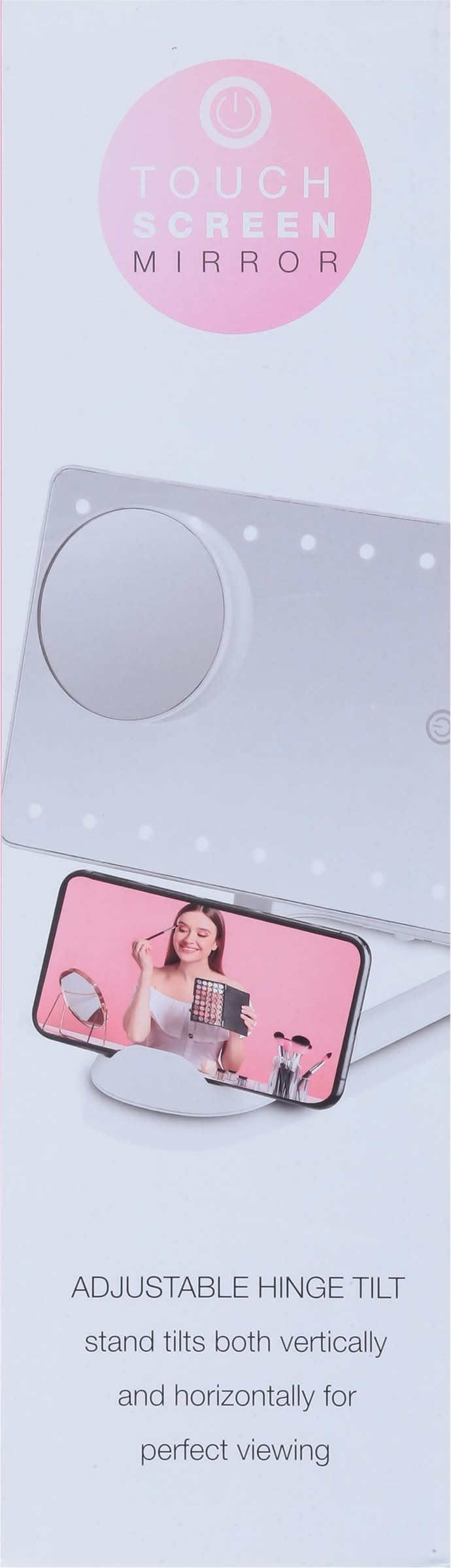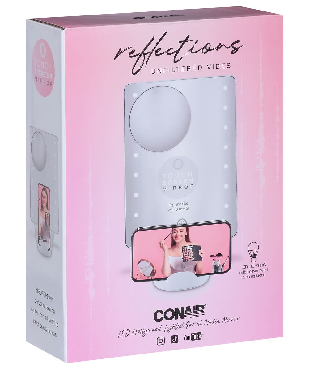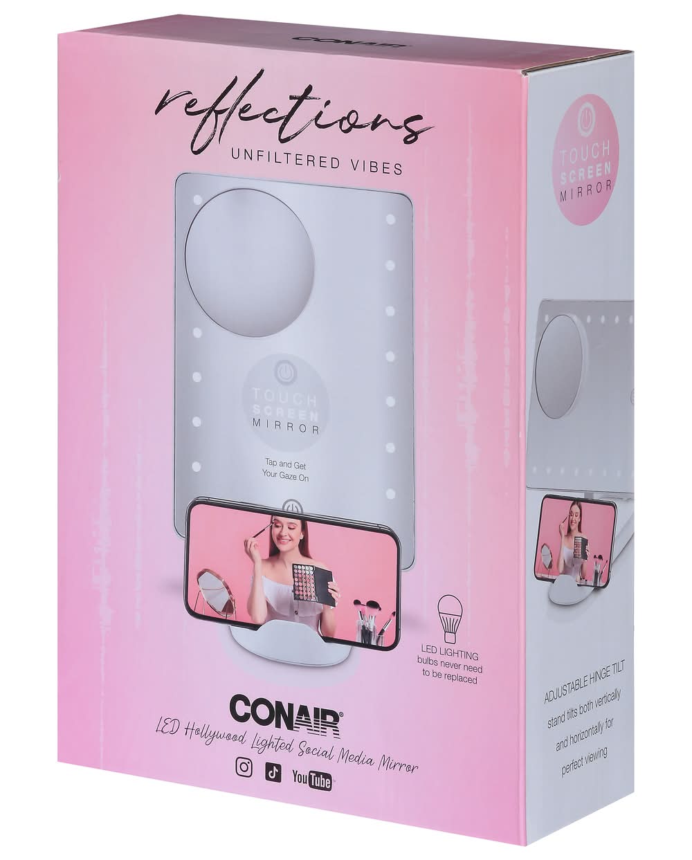 BE05TSM LED hollywood lighted social media mirror. Reflections. Unfiltered vibes. Tap and get your gaze on. LED lighting bulbs never need to be replaced. Light for a lifetime of beauty. Our LED bulbs won't burn out or need replacing - ever. Experience energy-efficient, ambient light for precise makeup application and grooming. Slim Profile, Convenient Folding lay flat or hang for convenient storage. Custom Viewing with 1x/10x magnetic spot magnification. Touch Control provides 3 light settings: low, medium, high. Phone holder perfect for creating content and following beauty tutorials. Adjustable stand tilts both vertically and horizontally for perfect viewing. For continued enjoyment of this product, please read instruction booklet prior to using. Battery Operated runs on 4 AAA batteries (not included). www.conair.com. Instagram. TikTok. Youtube. (hashtag)selfie ready. For info on any Conair product, call 1-800-3-Conair or visit us on the web at www.conair.com. Made in China. Packaging: Reusable