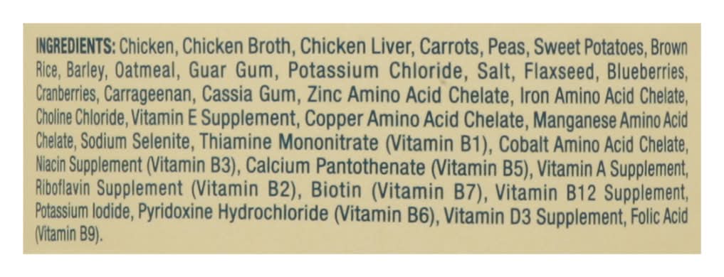 Ingredients: Chicken, Chicken Broth, Chicken Liver, Carrots, Peas, Sweet Potatoes, Brown Rice, Barley, Oatmeal, Guar Gum, Potassium Chloride, Salt, Flaxseed, Blueberries, Cranberries, Carrageenan, Cassia Gum, Zinc Amino Acid Chelate, Iron Amino Acid Chelate, Choline Chloride, Vitamin E Supplement, Copper Amino Acid Chelate, Manganese Amino Acid Chelate, Sodium Selenite, Thiamine Mononitrate (Vitamin B1), Cobalt Amino Acid Chelate, Niacin Supplement (Vitamin B3), Calcium Pantothenate (Vitamin B5), Vitamin A Supplement, Riboflavin Supplement (Vitamin B2), Biotin (Vitamin B7), Vitamin B12 Supplement, Potassium Iodide, Pyridoxine Hydrochloride (Vitamin B6), Vitamin D3 Supplement, Folic Acid (Vitamin B9)