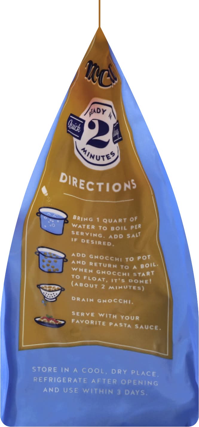 Directions for use: Directions: Remember: Gnocchi is ready when it floats. Bring 1 quart of water to boil per serving. Add salt if desired. Add Gnocchi to pot and return to a boil. When gnocchi start to float, it's done! (About 2 minutes). Drain gnocchi. Serve with your favorite pasta sauce. 2 servings per package. Store in a cool, dry place. Refrigerate after opening and use within 3 days. Storage recommendation: Store in a cool, dry place. Refrigerate after opening and use within 3 days.