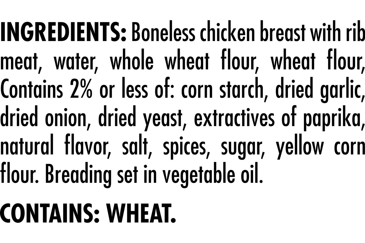 Boneless chicken breast with rib meat, water, whole wheat flour, wheat flour, Contains 2% or less of: corn starch, dried garlic, dried onion, dried yeast, extractives of paprika, natural flavor, salt, spices, sugar, yellow corn flour. Breading set in vegetable oil. Contains: Wheat, Corn