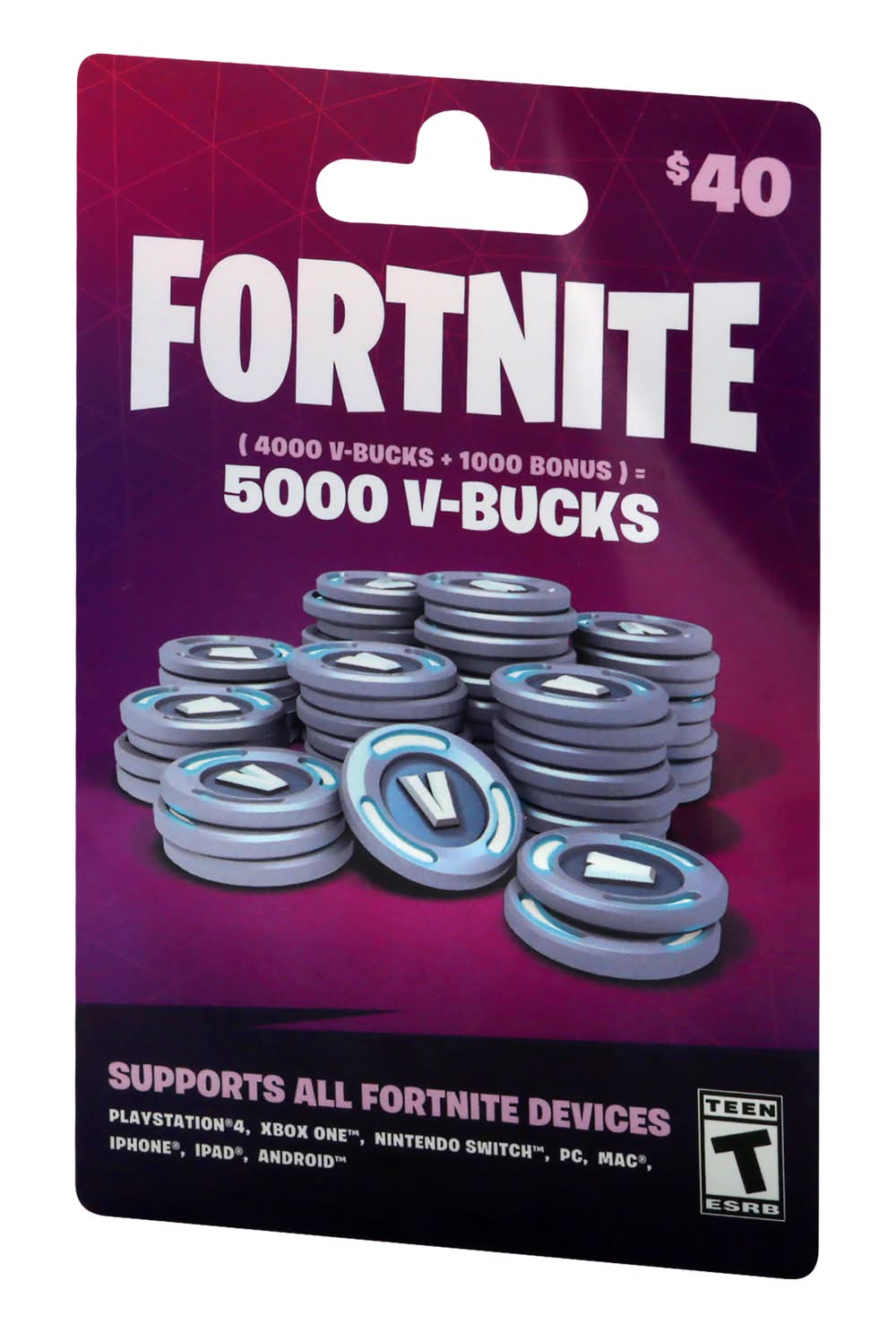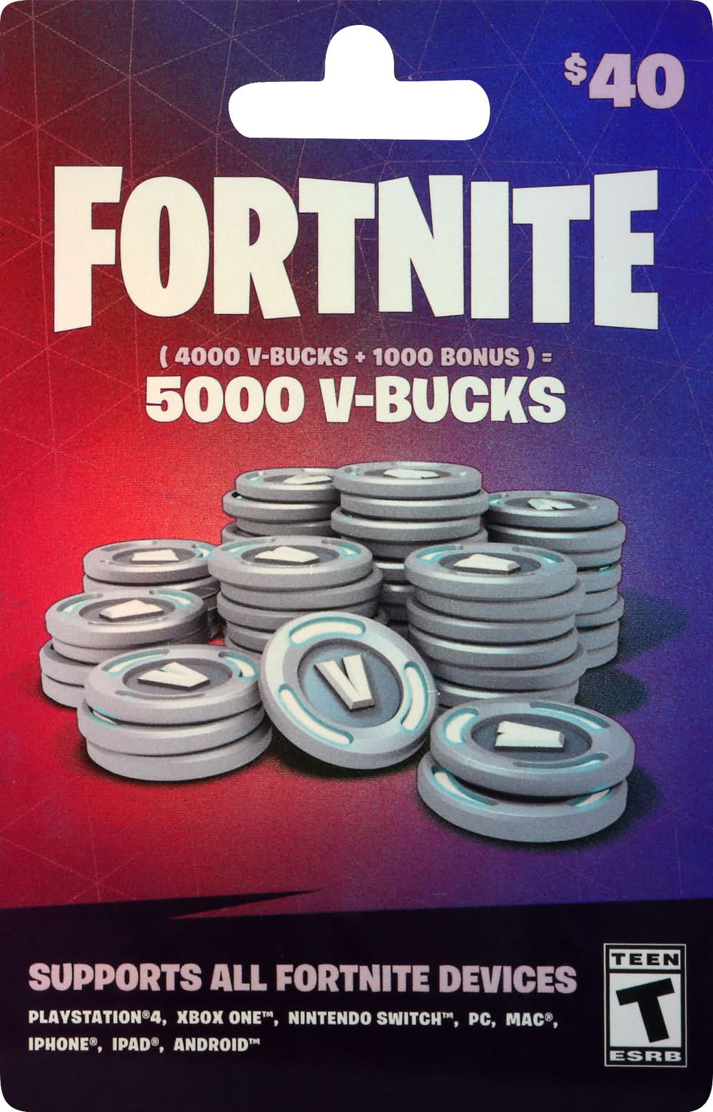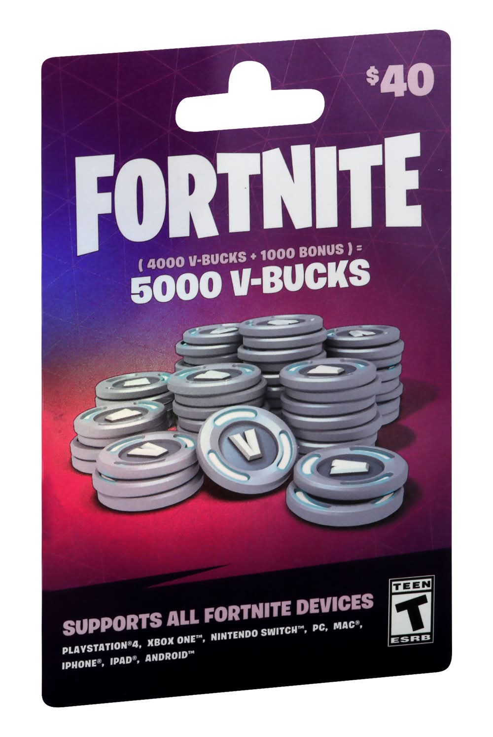 4000 V-Bucks + 1000 bonus = 5000 V-Bucks. Supports All Fortnite Devices: Playstation 4, Xbox One, Nintendo Switch, PC, Mac, iPhone, iPad, Android. No value until activated at register. To redeem your V-Bucks, enter the pin below at fortnite.com/vbuckscard. For support visit fortnite.com/support. Gift Card Mall,