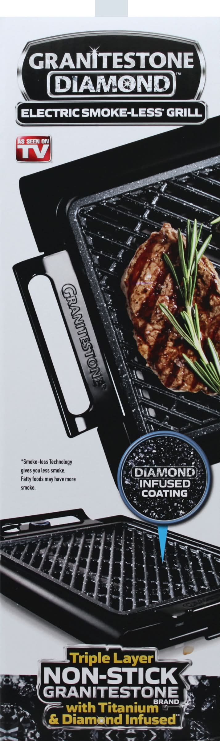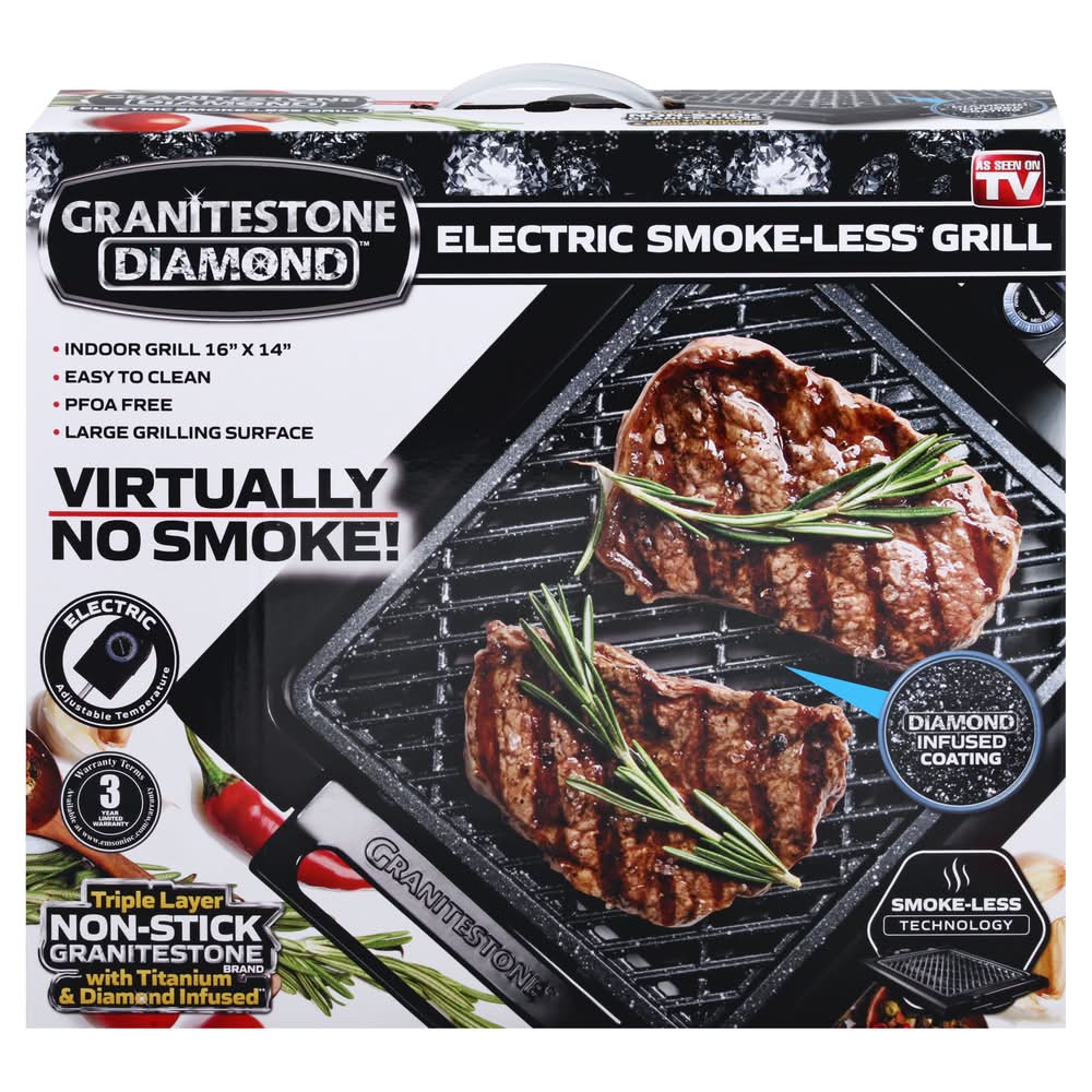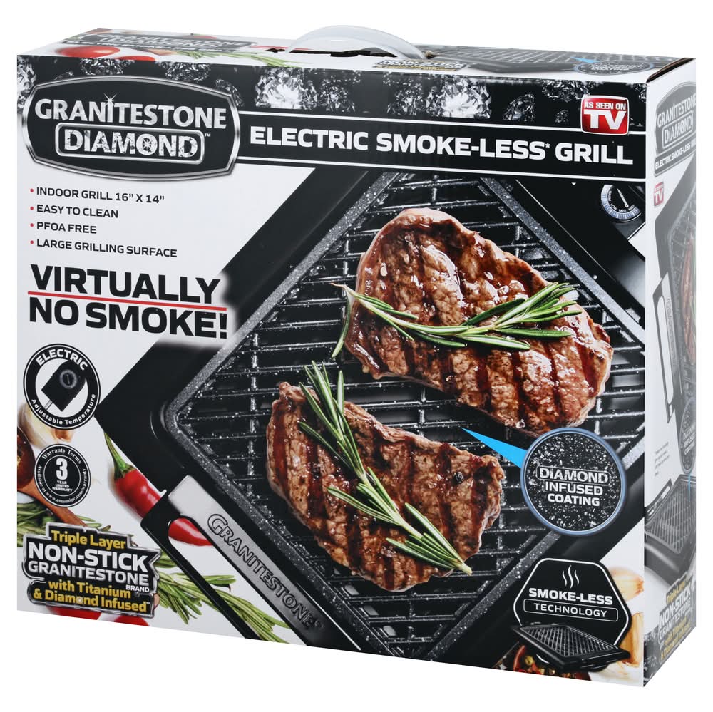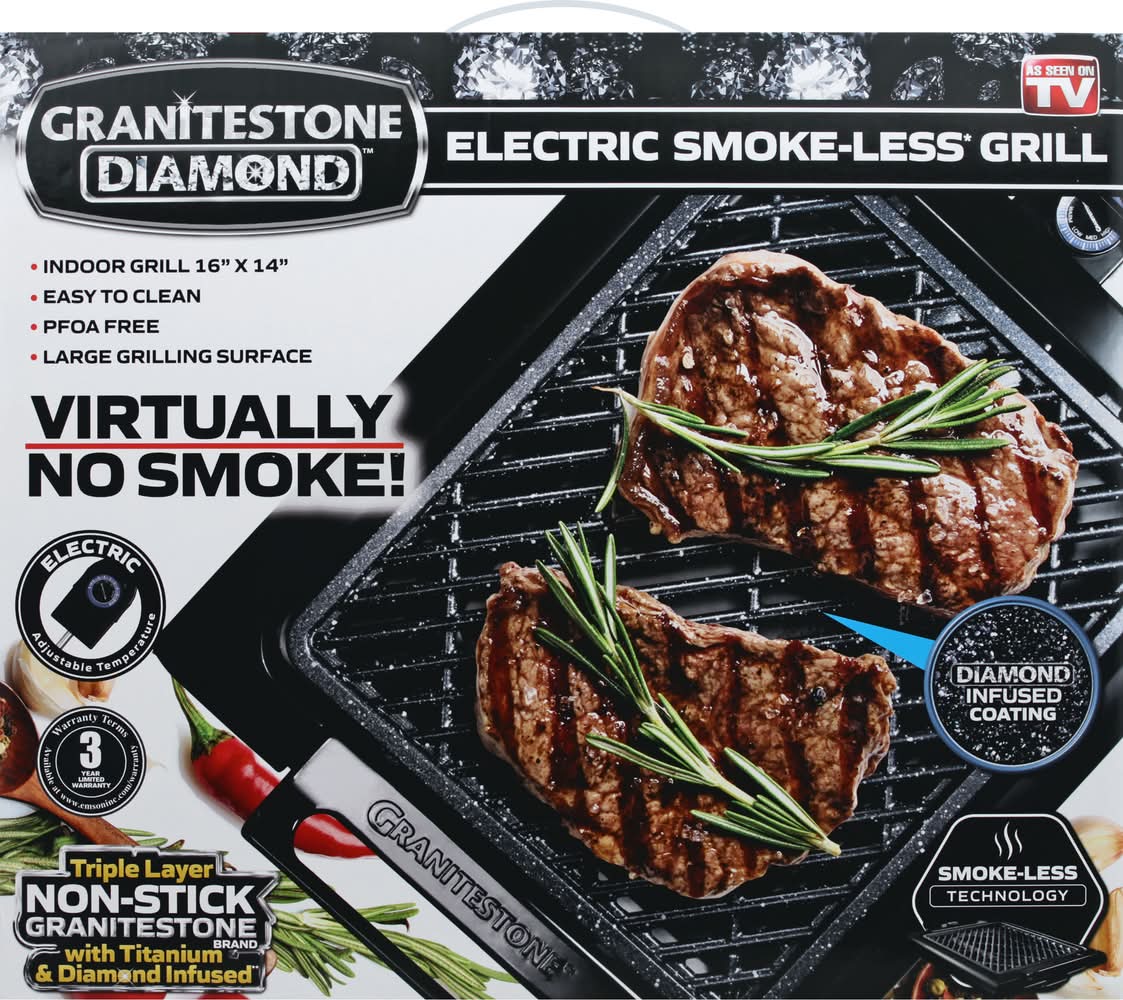 Indoor grill 16 inches x 14 inches. Electric smoke-less (Smoke-less technology gives you less smoke. Fatty foods may have more smoke) grill. As seen on TV. Easy to clean. PFOA free. Large grilling surface. Virtually no smoke! Electric adjustable temperature. Diamond infused coating. Triple layer non-stick granitestone brand with titanium & diamond infused (Lab created diamond dust infused). For household use only. 3 year limited warranty. ETL listed - Intertek. Made in China.
