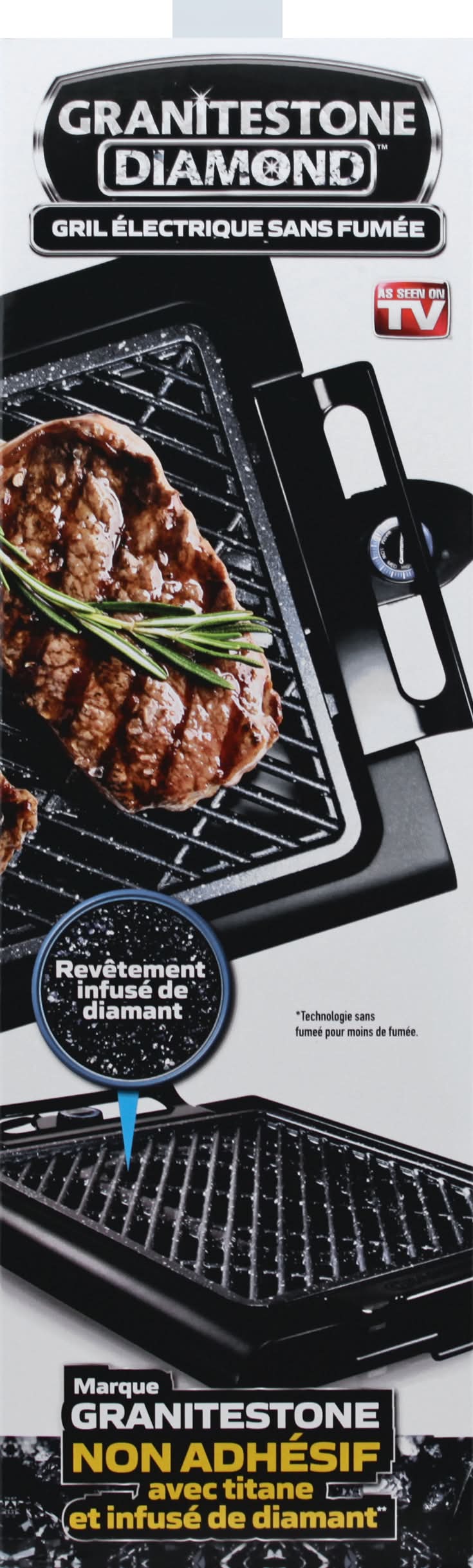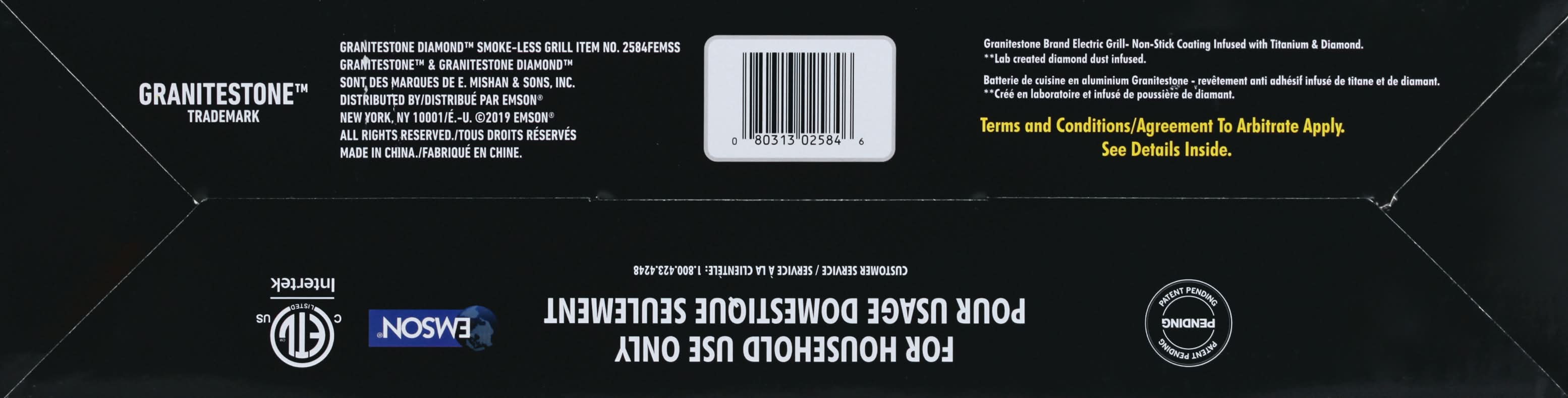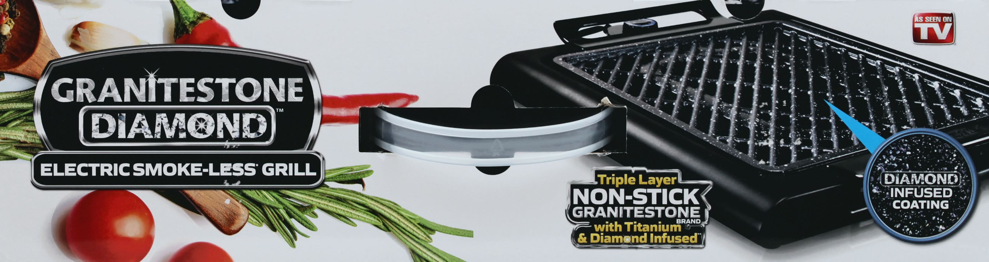 Indoor grill 16 inches x 14 inches. Electric smoke-less (Smoke-less technology gives you less smoke. Fatty foods may have more smoke) grill. As seen on TV. Easy to clean. PFOA free. Large grilling surface. Virtually no smoke! Electric adjustable temperature. Diamond infused coating. Triple layer non-stick granitestone brand with titanium & diamond infused (Lab created diamond dust infused). For household use only. 3 year limited warranty. ETL listed - Intertek. Made in China.