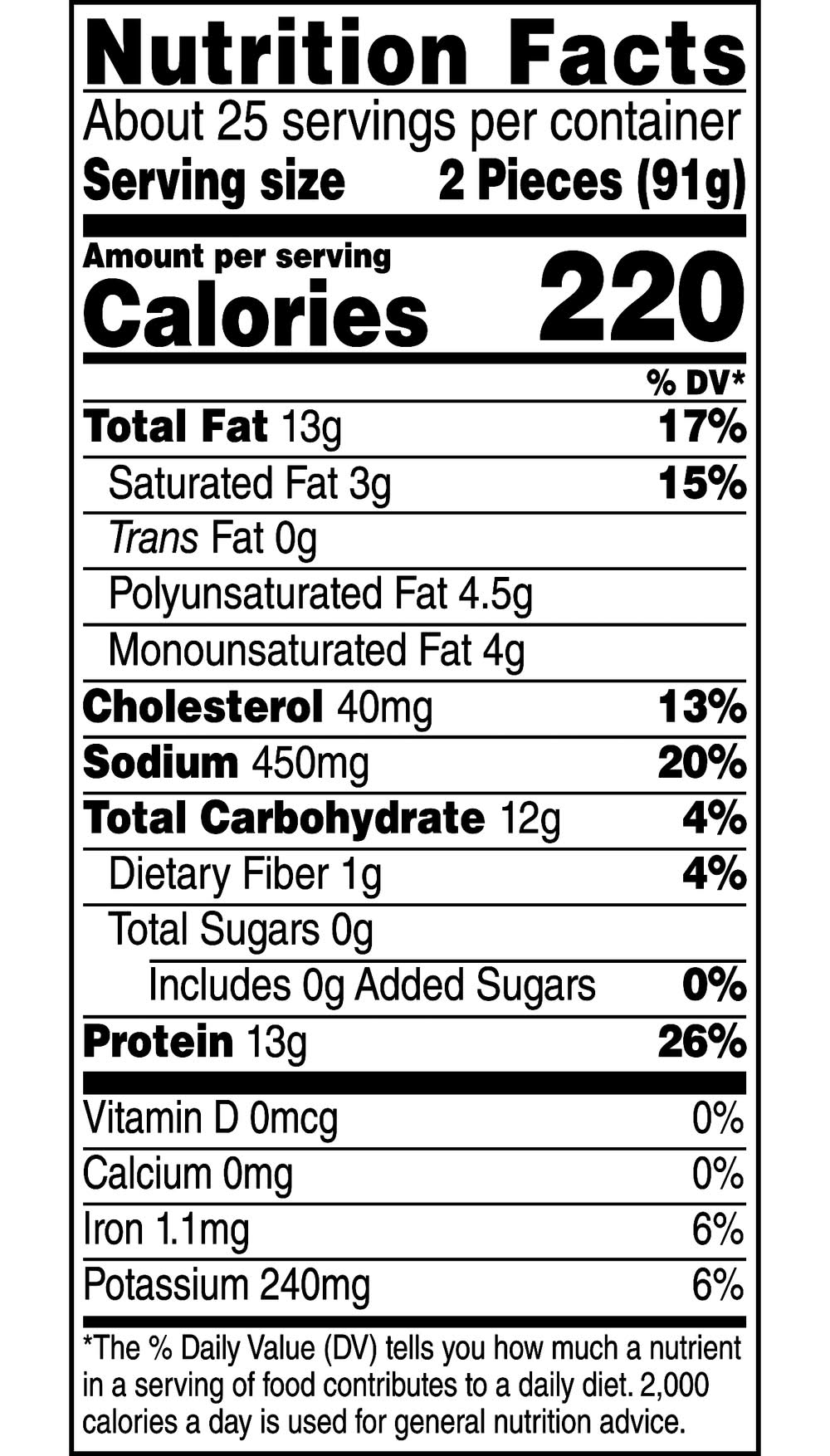 White Meat Chicken, Water, Whole Wheat Flour, Wheat Flour, Contains 2% or Less of: Dried Garlic, Dried Onion, Dried Yeast, Extractives Of Paprika, Food Starch, Natural Flavoring, Salt, Soybean Oil, Spice, Sugar, Yellow Corn Flour. Breading Set in Vegetable Oil. Contains: Wheat