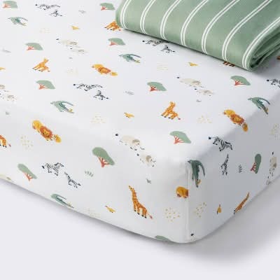 This 2-Pack of Fitted Jersey Crib Sheets from cloud island includes two fitted crib sheets designed to fit standard cribs and toddler beds. Made from soft jersey cotton with spandex, these standard crib sheets fit six-inch mattresses and are designed with all-around elastic for a secure fit. The pack includes two sheets — one with cute woodland animals on a white backdrop and the other featuring white stripes on a green backdrop — to add sweet flair to your little one's nursery decor. cloud island: Designed with love. Made without compromise.