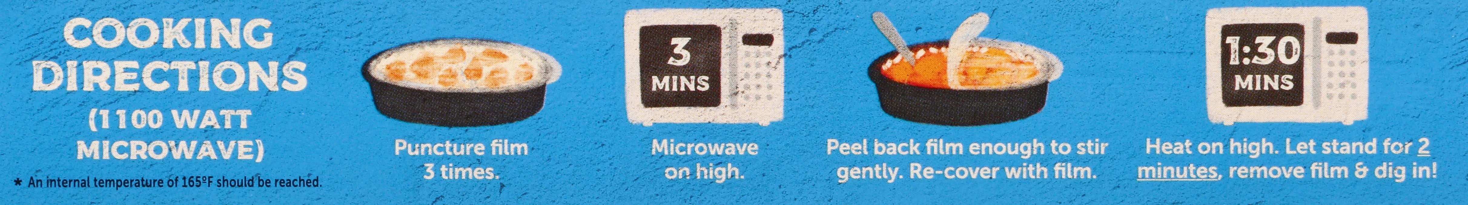 Directions for use: Cooking Directions (1100 Watt Microwave). An internal temperature of 165 degrees F should be reached. Puncture film 3 times. Microwave on high. Peel back film enough to stir gently. Re-cover with film. Heat on high. Let stand for 2 minutes, remove film & dig in! For a complete experience, pair with our: chicken tikka samosas & garlic naan. Keep frozen. Storage recommendation: Keep frozen.