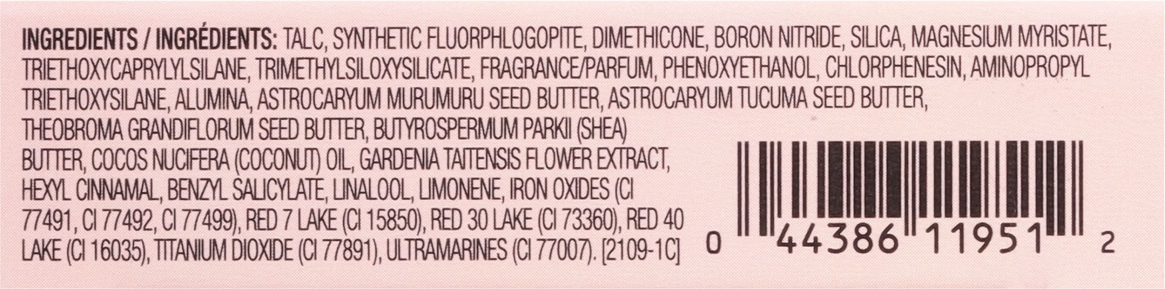 Ingredients: Talc, Synthetic Fluorphlogopite, Dimethicone, Boron Nitride, Silica, Magnesium Myristate, Triethoxycaprylylsilane, Trimethylsiloxysilicate, Fragrance/Parfum, Phenoxyethanol, Chlorphenesin, Aminopropyl Triethoxysilane, Alumina, Astrocaryum Murumuru Seed Butter, Astrocaryum Tucuma Seed Butter, Theobroma Grandiflorum Seed Butter, Butyrospermum Parkii (Shea) Butter, Cocos Nucifera (Coconut Oil Gardenia Taitensis Flower Extract Hexyl Cinnamal Benzyl Salicylate Linalool Limonene Iron Oxides (CI 77491 CI 77492 CI 77499), Red 7 Lake (CI 15850), Red 30 Lake (CI 73360), Red 40 Lake (CI 16035), Titanium Dioxide (CI 77891), Ultramarines (CI 77007)