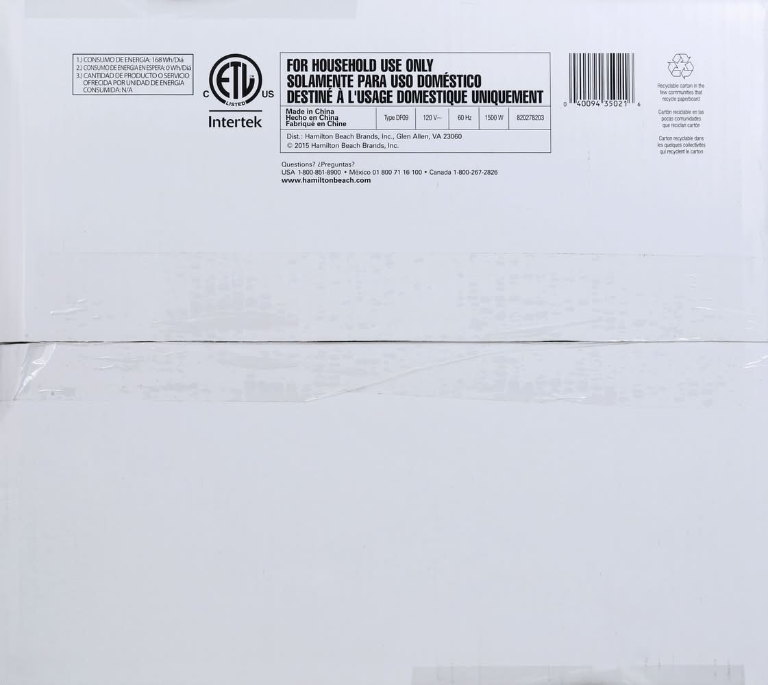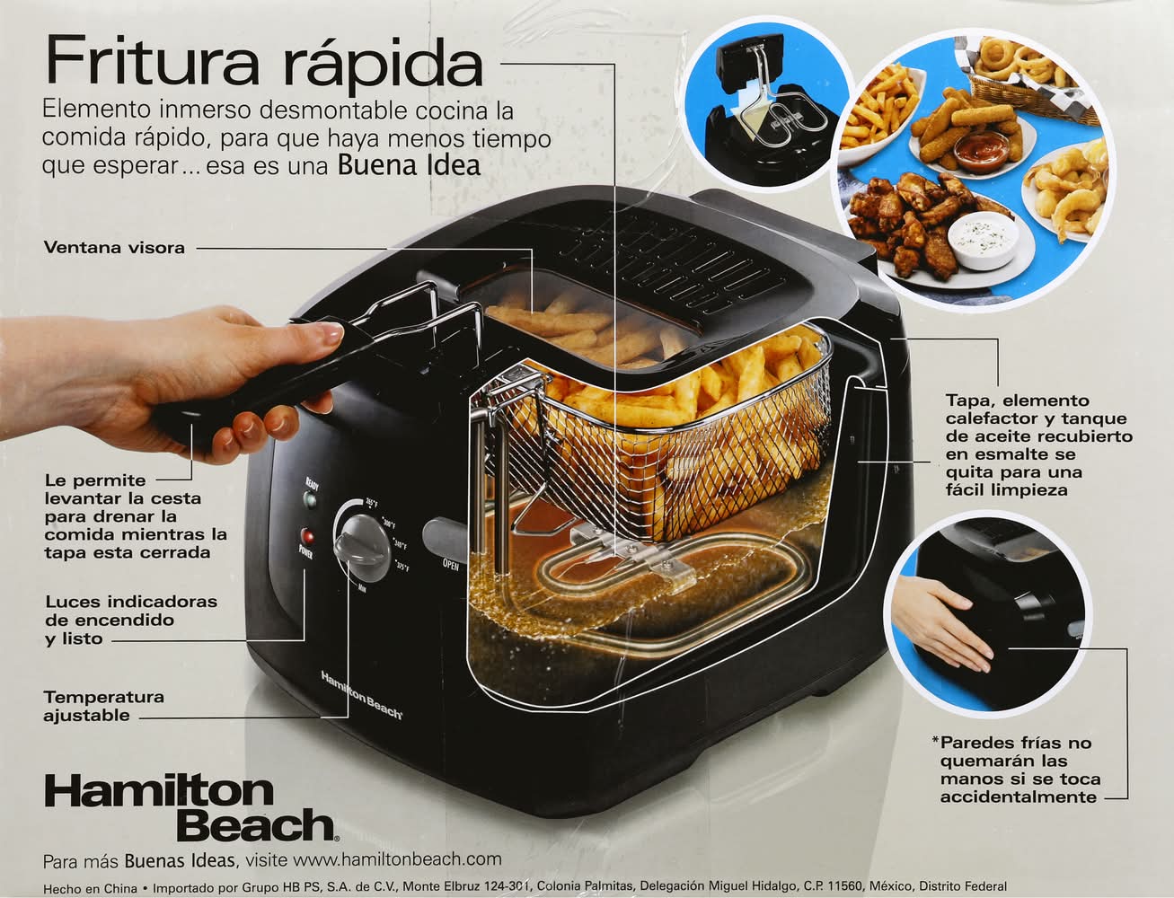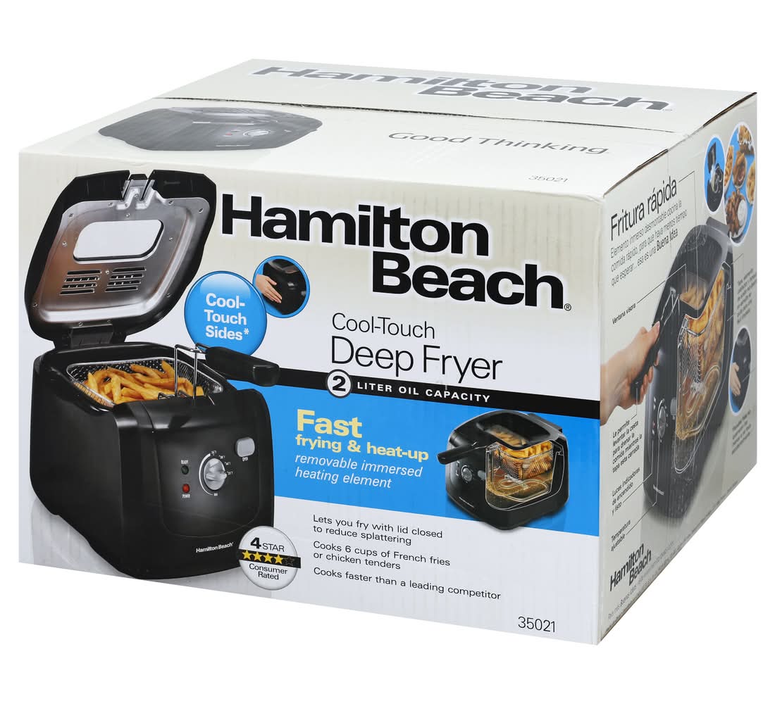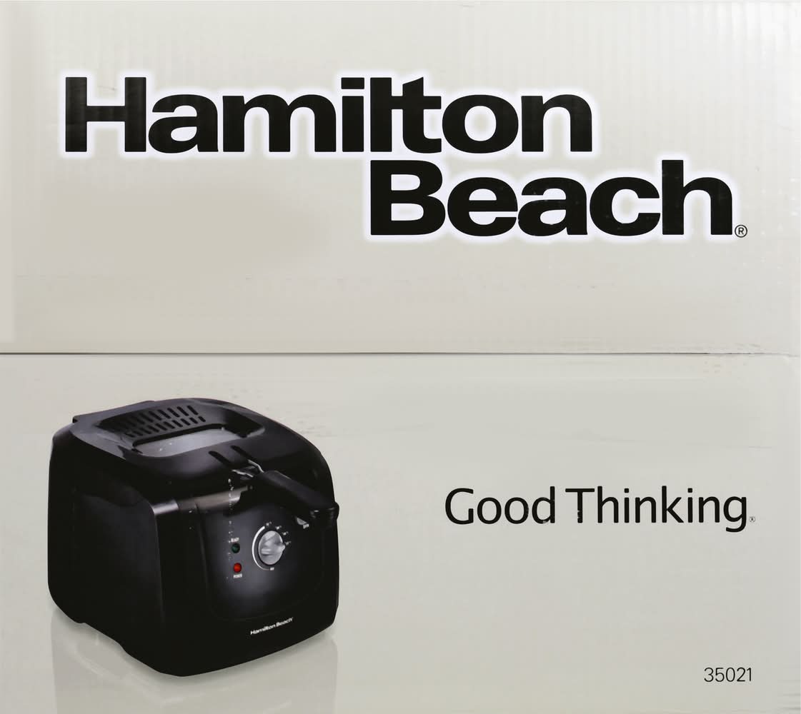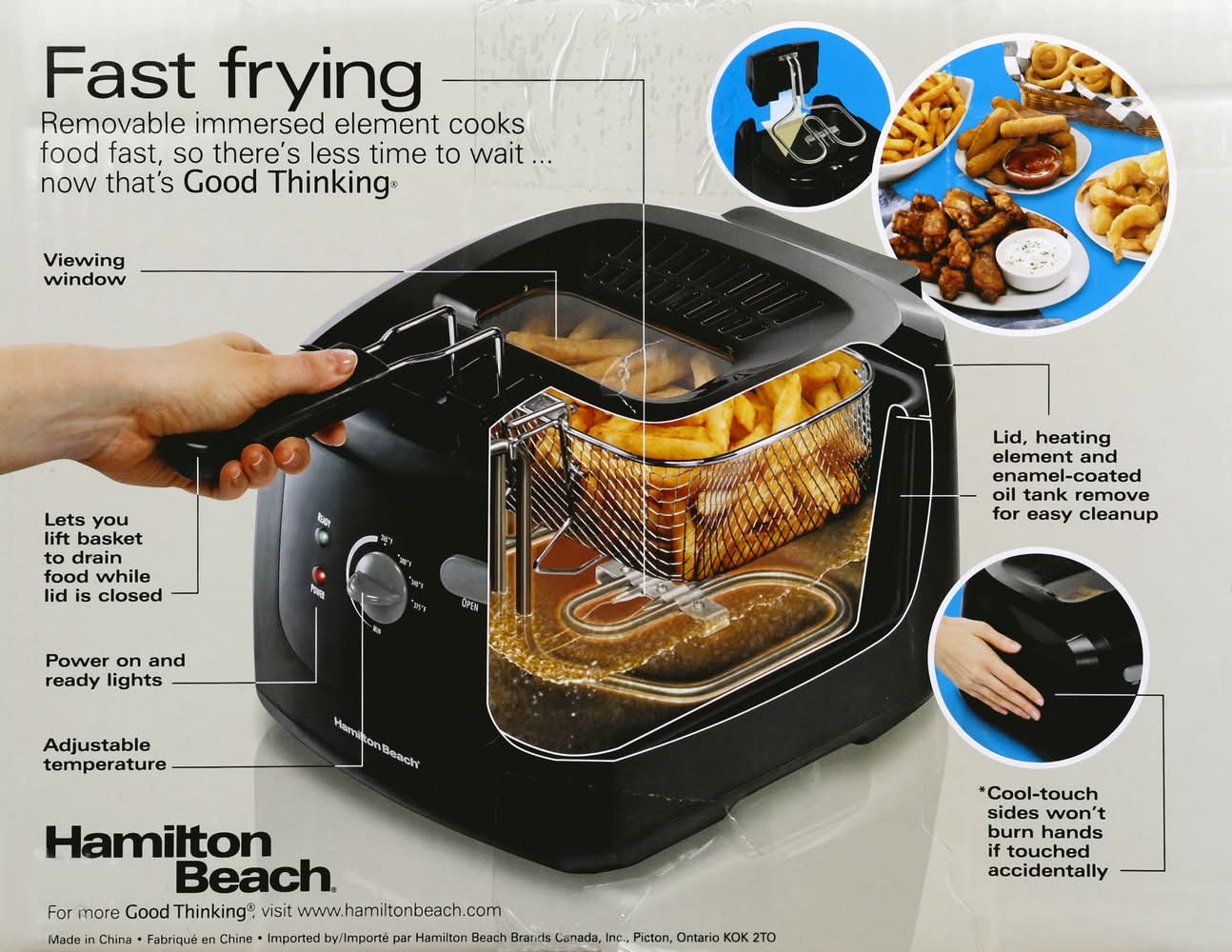 Fast frying & heat-up removable immersed heating element. 2 liter oil capacity. Cool Touch sides (Cool-touch sides won't burn hands if touched accidentally). Lets you fry with lid closed to reduce splattering. Cooks 6 cups of French fries or chicken tenders. Cooks faster than a leading competitor. 4 star consumer rated. Good thinking. Fast frying. Removable immersed element cooks food fast, so there's less time to wait - now that's good thinking. Viewing window. Lets you lift basket to drain food while lid is closed. Power on and ready lights. Adjustable temperature. Lid heating element and enamel-coated oil tank remove for easy cleanup. ETL listed - Intertek. www.hamiltonbeach.com. For more good thinking, visit www.hamiltonbeach.com. Questions? USA 1-800-851-8900. Canada 1-800-267-2826. Recyclable carton in the few communities that recycle paperboard. Made in China. • Hamilton Beach Brands Inc., • Packaging: Reusable