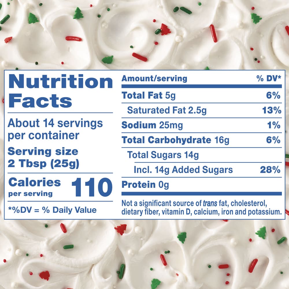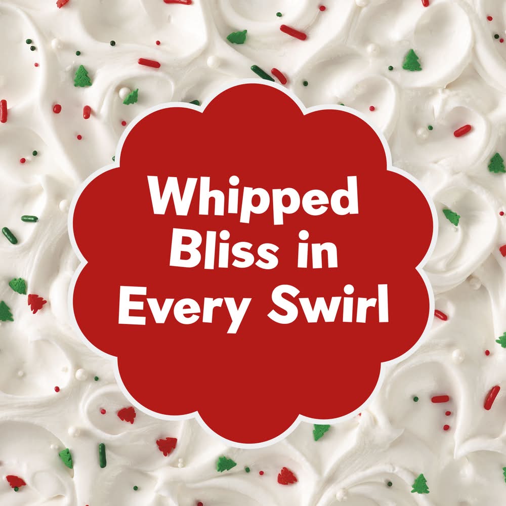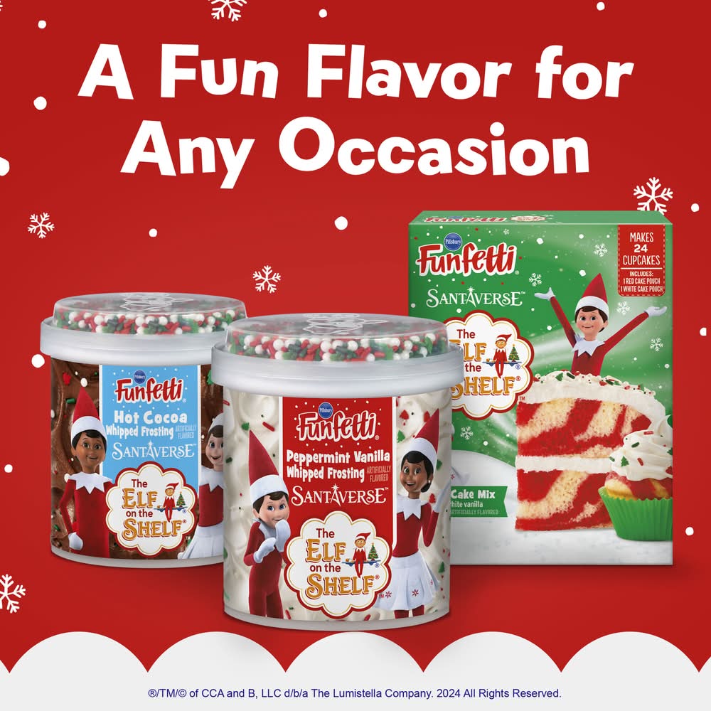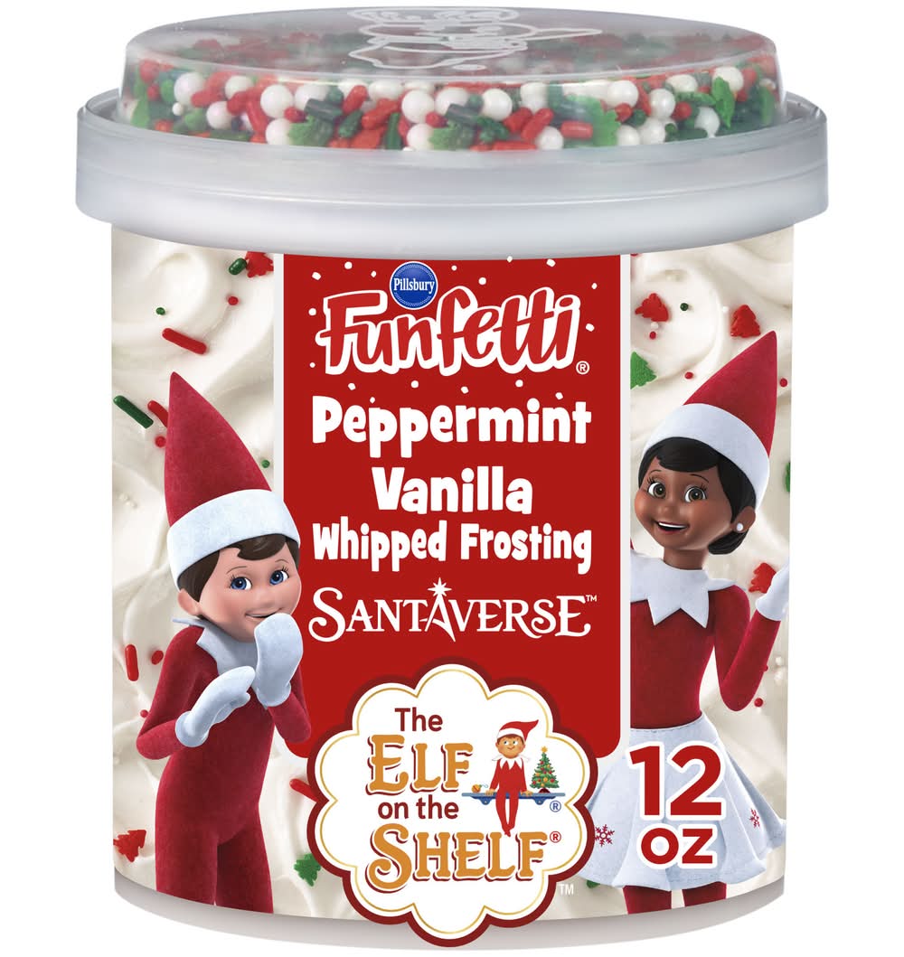 Spread Christmas cheer and some frosting with our Pillsbury Funfetti The Elf on the Shelf Peppermint Vanilla Whipped Frosting. Delicious whipped peppermint vanilla frosting is accompanied by cheerful holiday sprinkles to add some extra celebration to your holiday cheer. Our gluten-free and Kosher Certified whipped peppermint vanilla frosting is easy to use and decorate with. Frost alone or have friends and family join the holiday cheer and help. Plus, with enough frosting for about 24 cupcakes in each tub, who knows what you'll create? Flavor: Peppermint vanilla