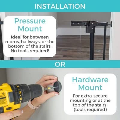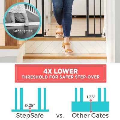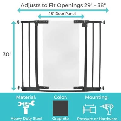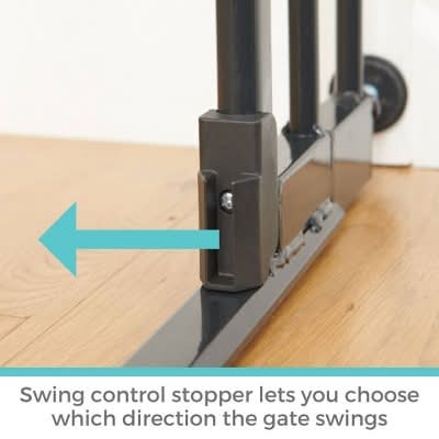 Introducing Toddleroo’s StepSafe Clear Walk-Thru Gate the perfect blend of safety and style for your little explorer! Designed for babies and toddlers, this chic black color metal baby gate with door is 30 inches tall and adjusts from 29 to 38 inches wide, ensuring a snug fit in your opening. The standout feature of the StepSafe Clear Walk-Thru Gate is its sleek, clear acrylic door panel. This innovative feature allows you to keep an eye on your toddler and see through while they play, giving you peace of mind without sacrificing style. And let’s not forget the ultra-low threshold of just 0.25 inches! While most gates have a 1.25-inch bottom bar, this gate offers a smooth step-over for effortless access, with a bar that is 4 times lower! Flexibility is key! The StepSafe can be pressure mounted for easy setup between rooms or hardware mounted for secure use at the top of stairs. Plus, it opens with just one hand, so you can juggle snacks, toys, and little ones like a pro. Its wide 18" door provides plenty of room to walk through with ease and the gravity-fed hinge effortlessly closes it behind you. For those times when you want the gate to quickly remain open, just move the door past 90 degrees and the hold-open feature will kick in, preventing closure. With the StepSafe Clear Walk-Thru Gate, you’re not just enhancing safety, you’re adding a modern touch to your home and staying connected to your child’s adventures. Every Toddleroo baby gate is JPMA and ASTM certified. Let the fun begin safely!